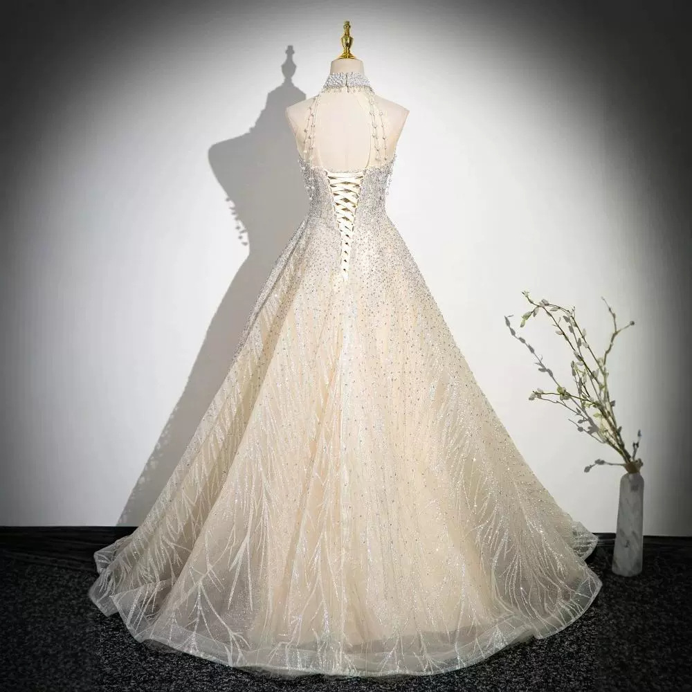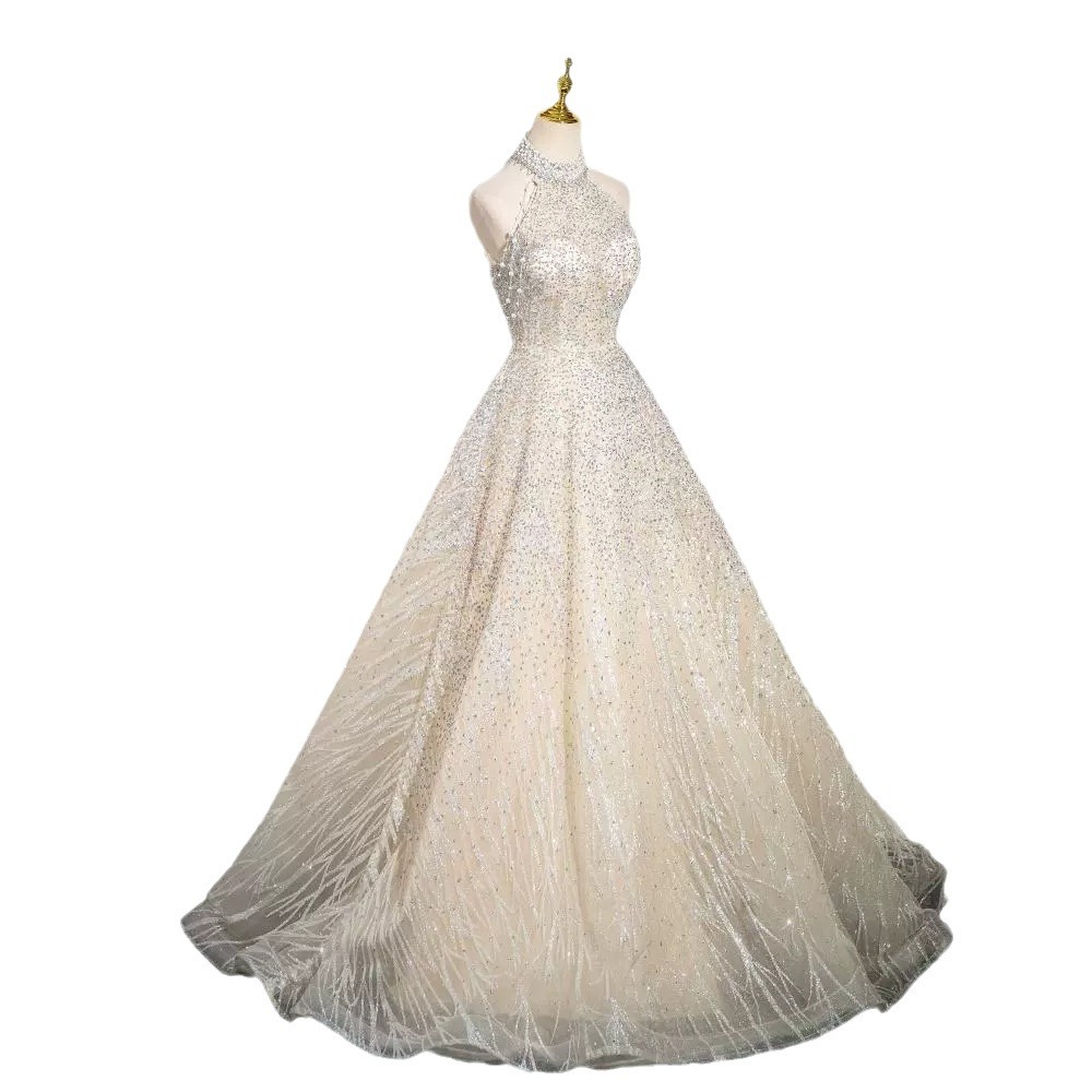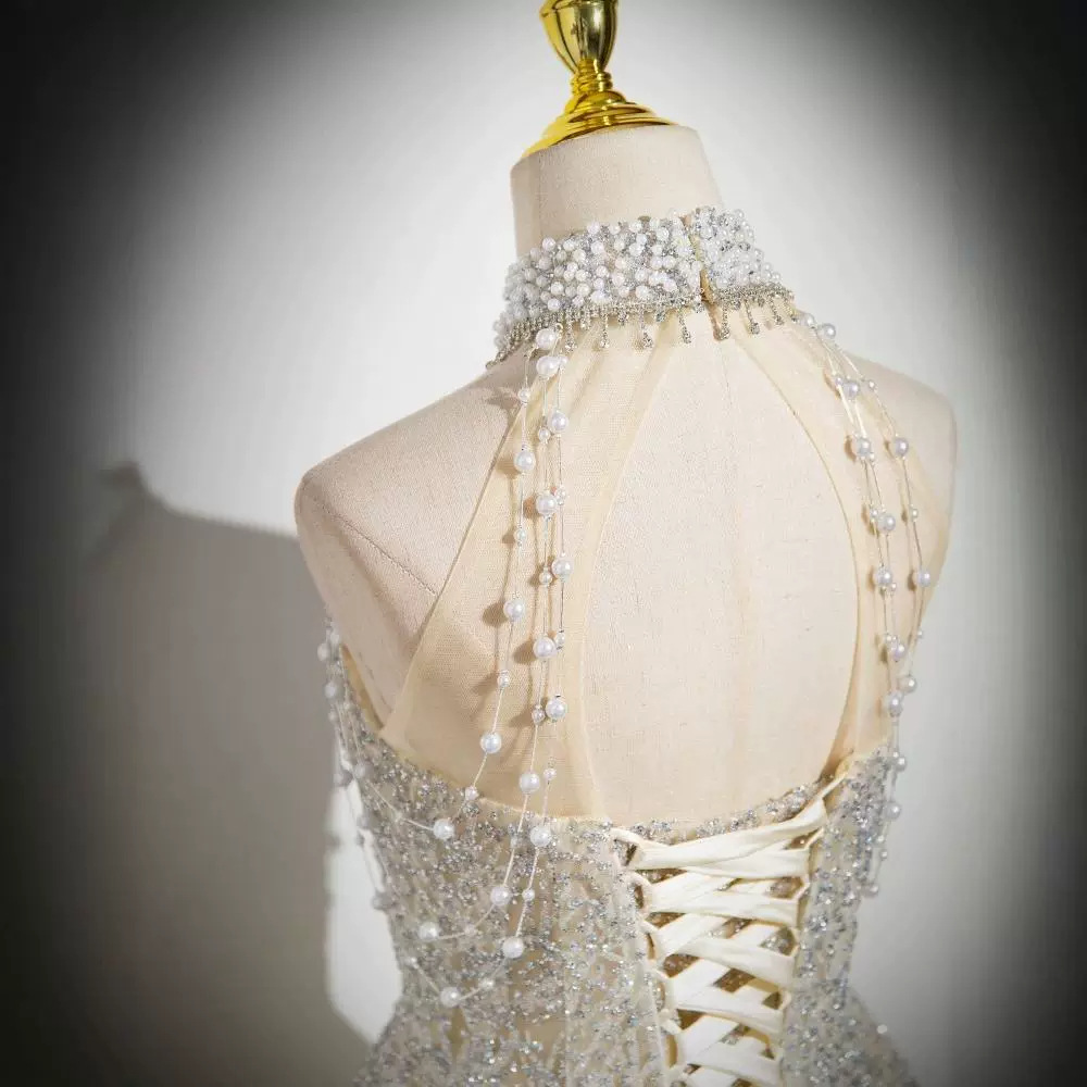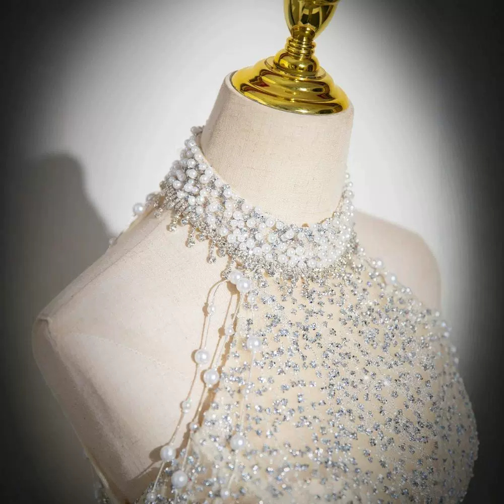 Evening Dress Women's 2025 New High-end Sense Veil Skirt High-end Light Luxury Niche Heavy Industry Neck Light Wedding Dress Host