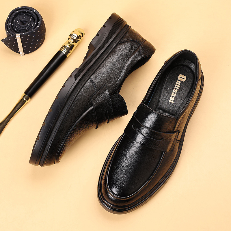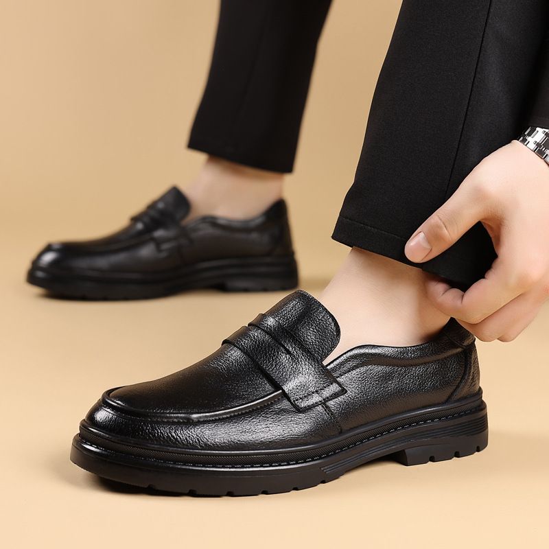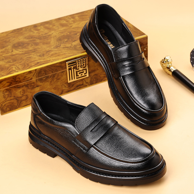 First-Layer Goatskin Men's Business Casual Leather Shoes Men's Thick-Soled Round-Toe Slip-Ons Fashion Versatile Trbottomy Shoes Driving Loafers