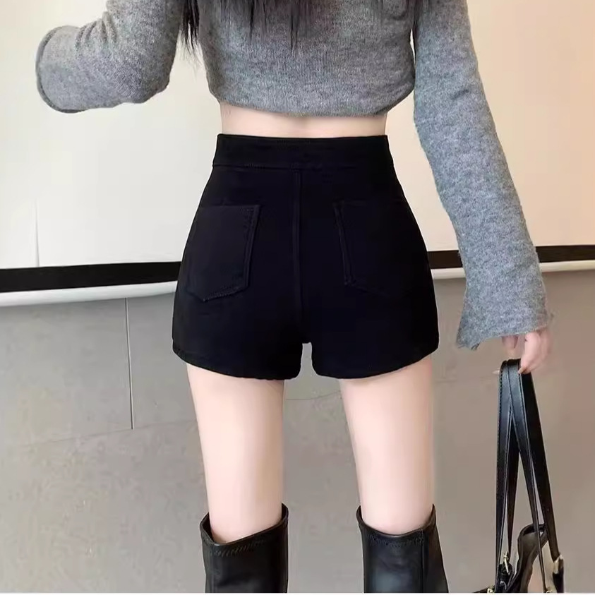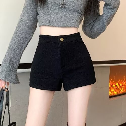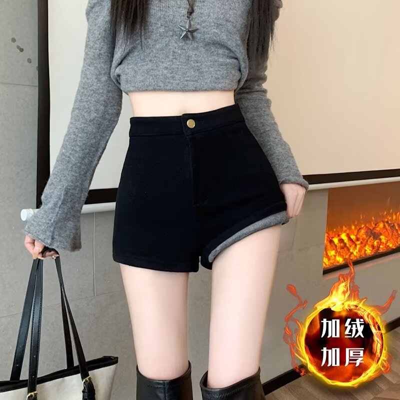 fleece-lined Thickened Black Denim Shorts Women's Autumn and Winter Fashionable All-Match New High Waist Slimming A- Shaped Hip Hot Pants