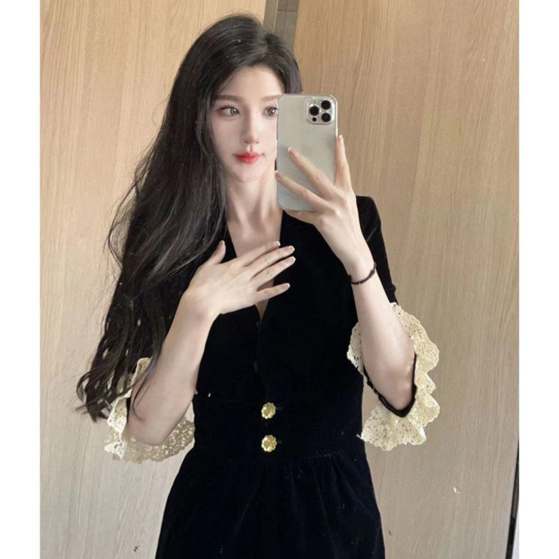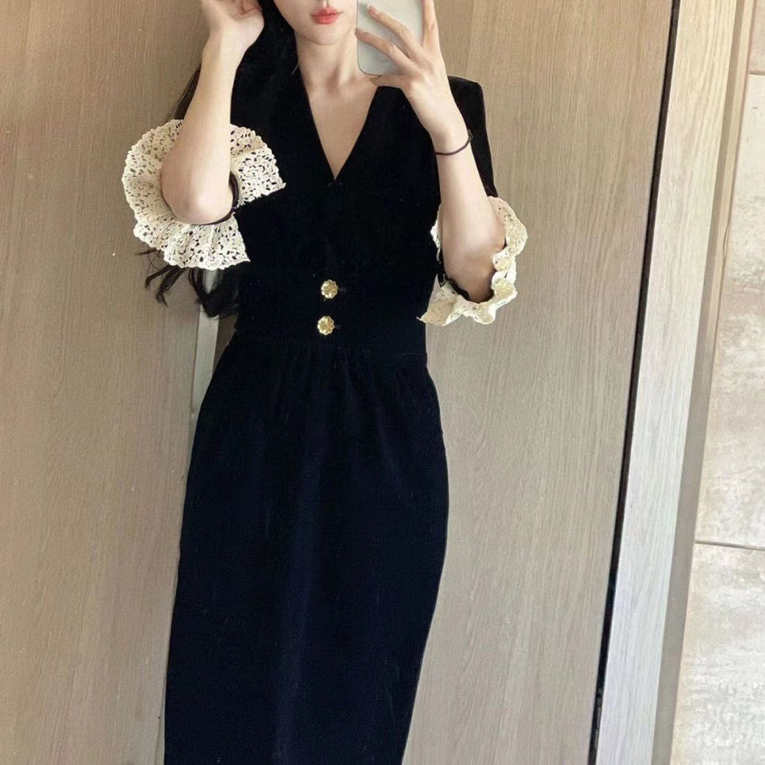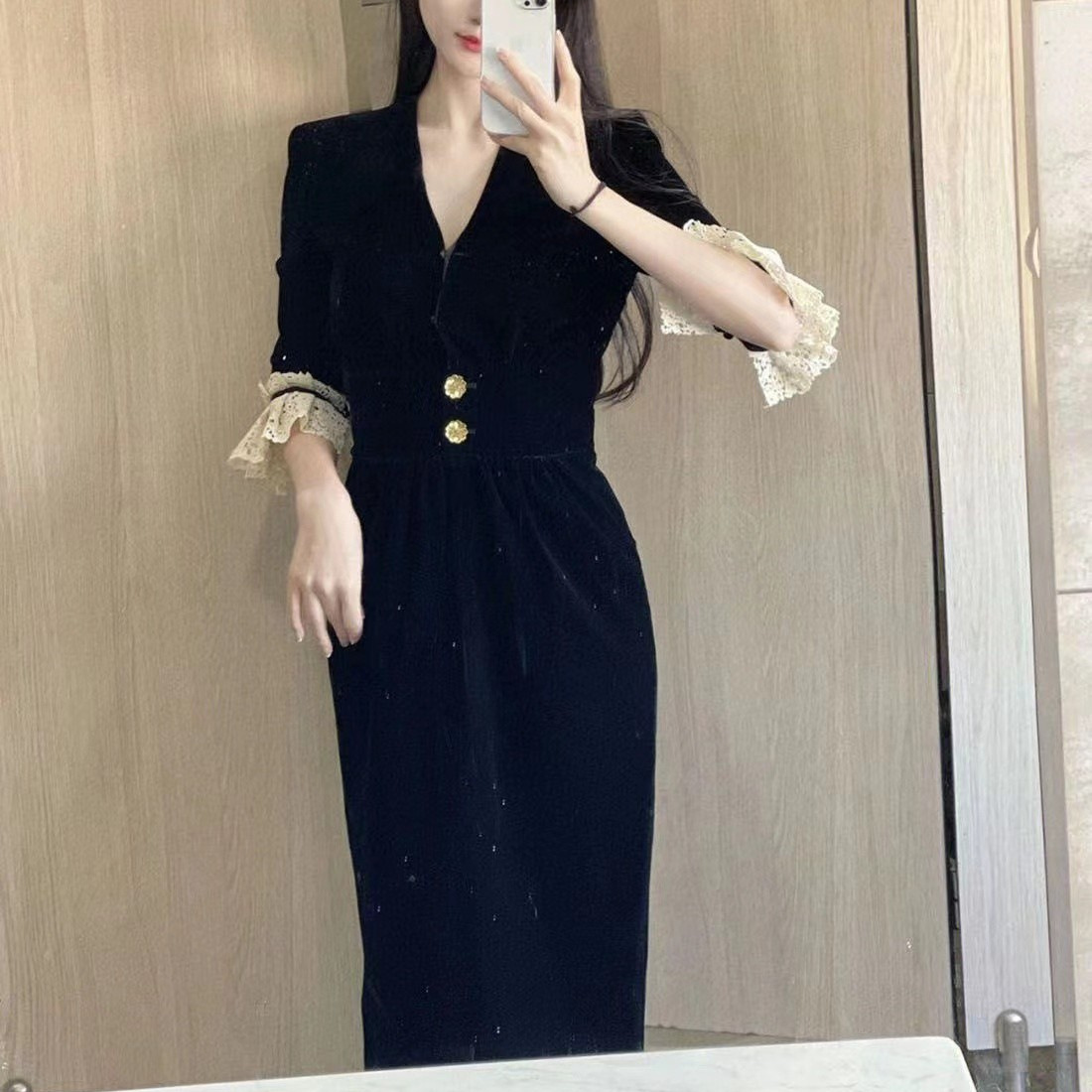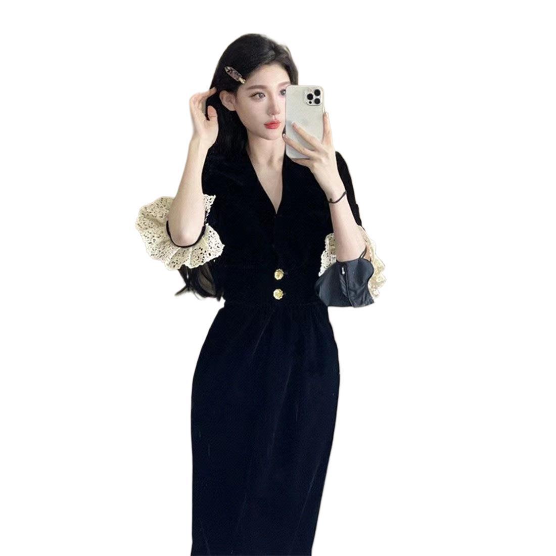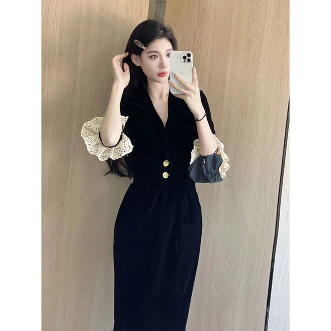 French Hepburn Style Black Velvet dress Autumn and Winter High-end Tight Waist Small Black Dress Light Luxury Niche Dress for Women