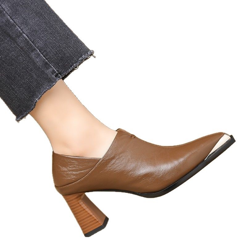 French Retro Brown Small Square Heel Shoes Women's 2025 Spring and Autumn New Soft Leather Chunky Heel Deep Mouth Side Zipper Shoes