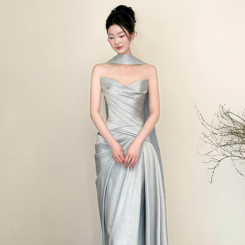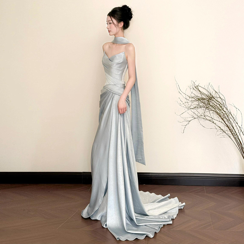 French-Style Bridal Morning Robe for Women, High-End Wedding Veil, Engagement High-End Light Luxury Toast Dress, Birthday Strapless Gown