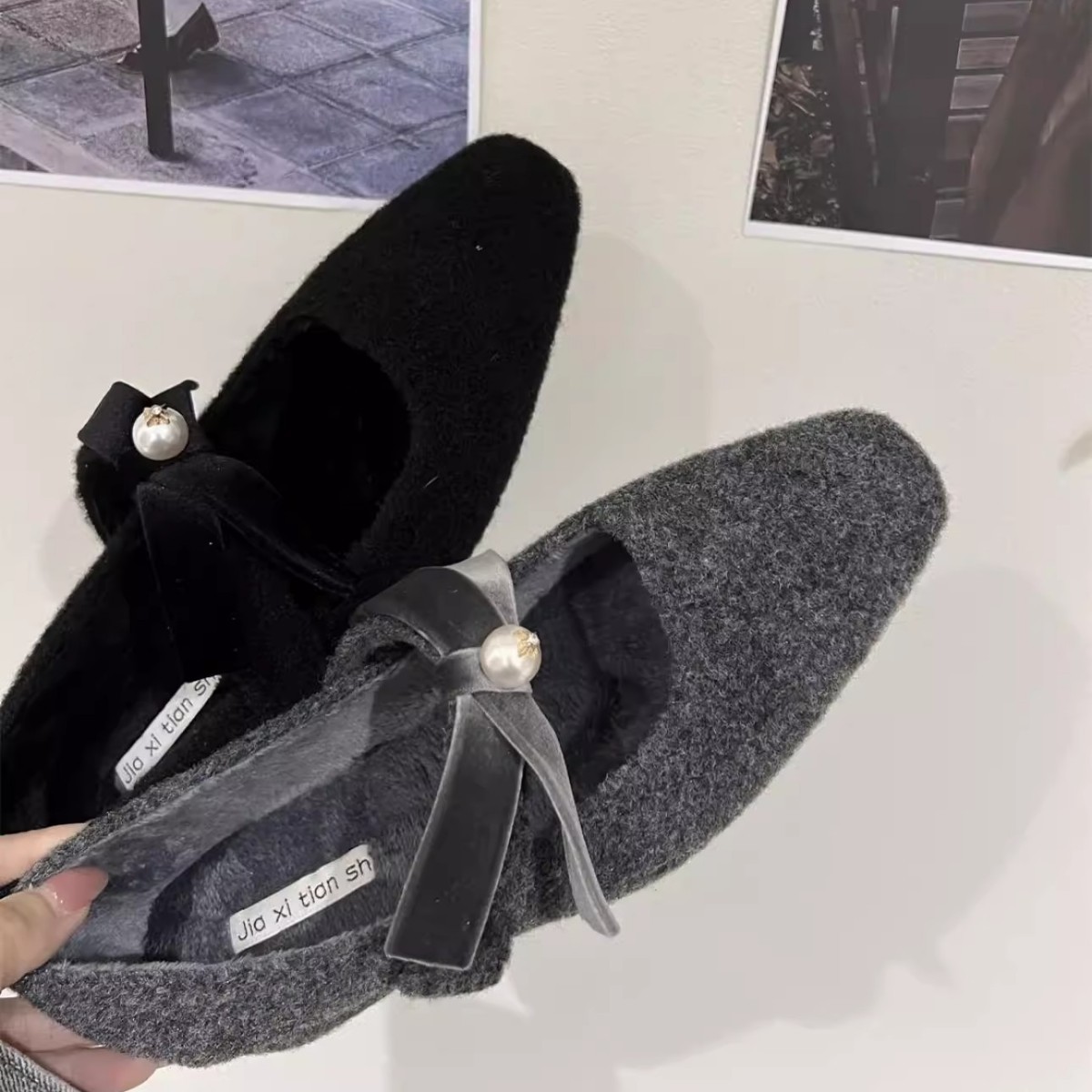 French Style Thick Heel Grey Woolen Single-layer Shoes with Skirt Evening Shoes Women's Winter fleece-lined Bow Mary Jane Mao Shoes