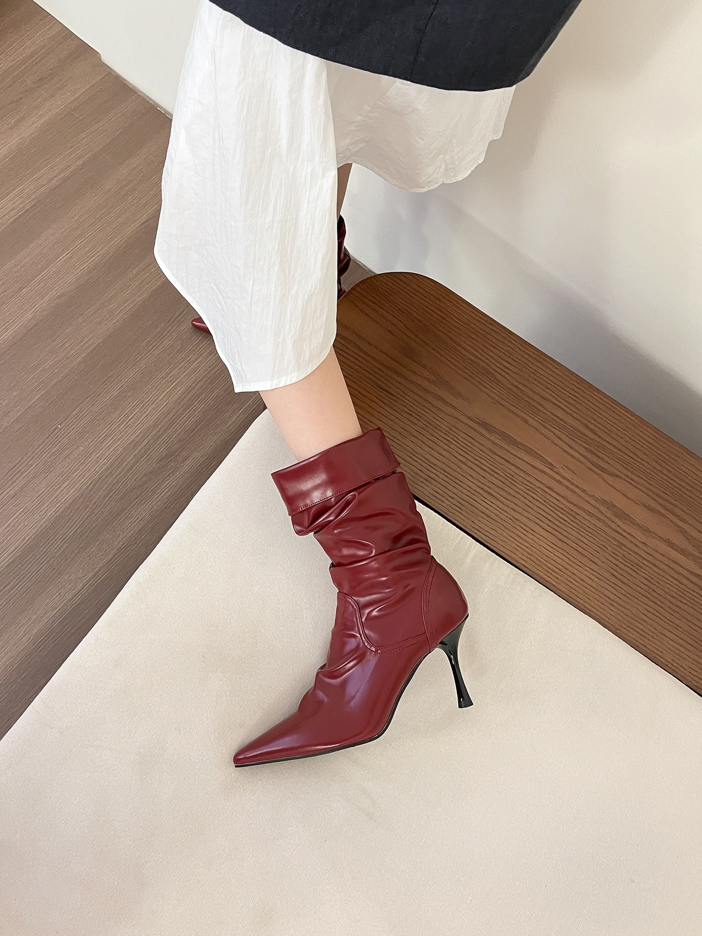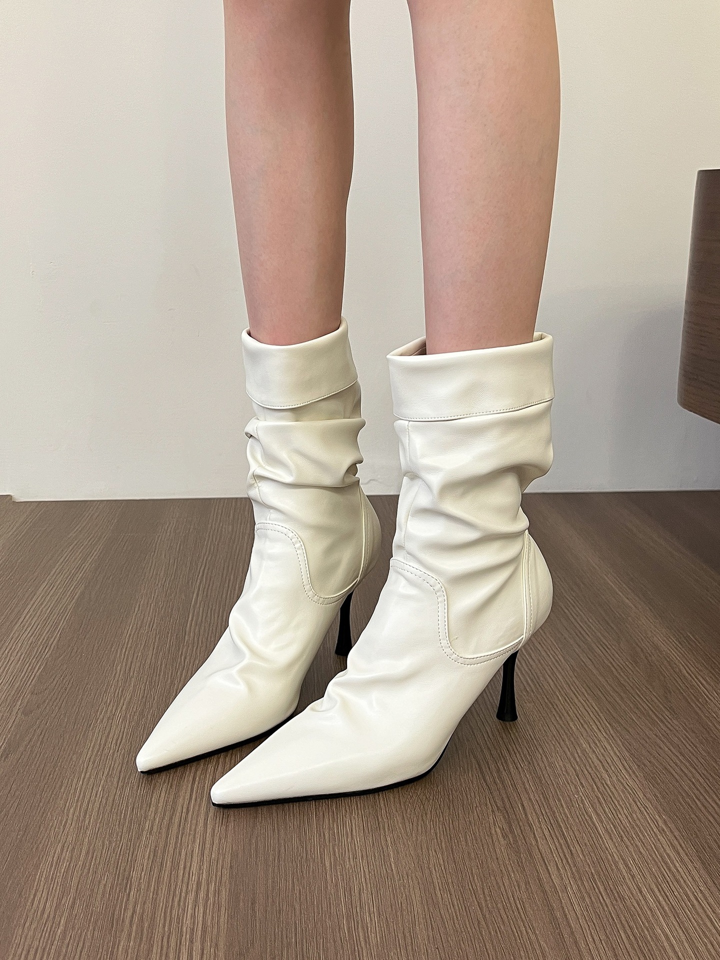 Gentle and Fashionable! Milky White Pointed Toe Pleated High-Heeled Short Boots for Women in Autum