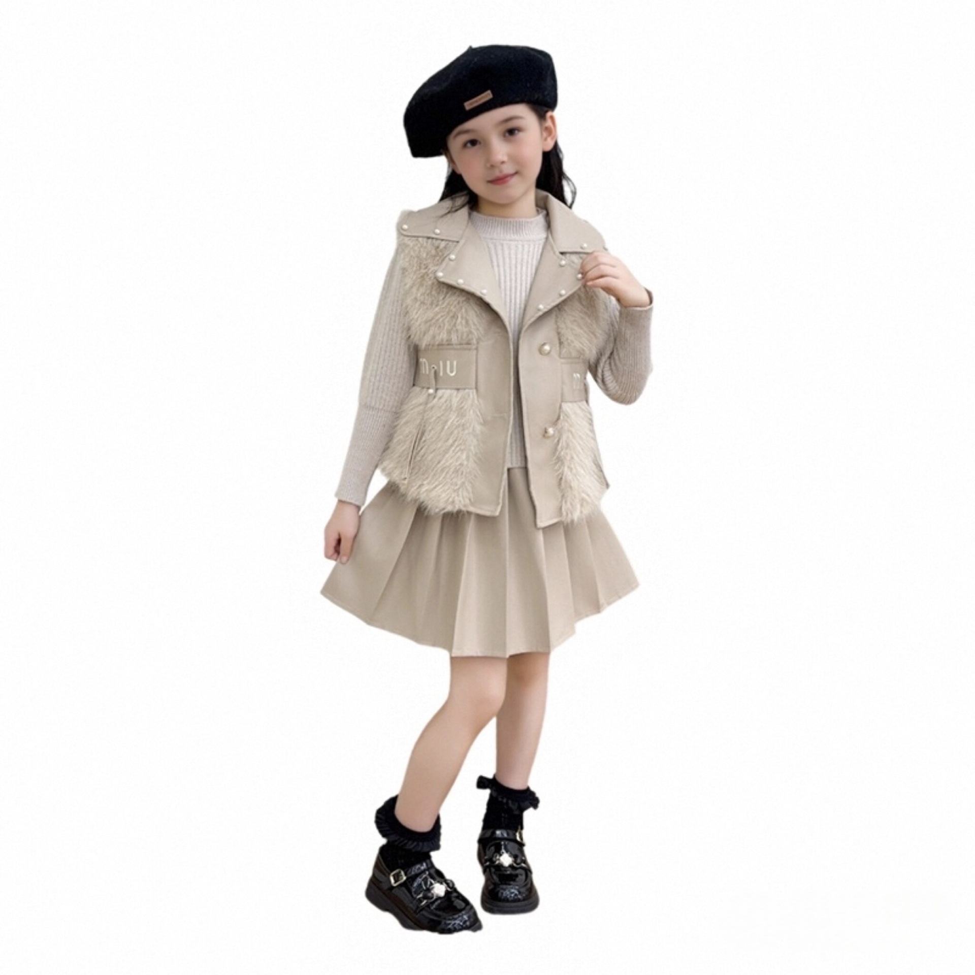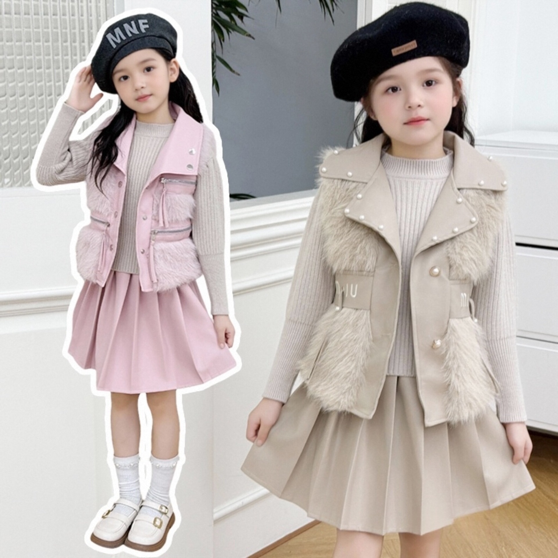 Girls' Autumn and Winter Skirt Suit, New Style, Kidsren's Imitation Fur Vest and Leather Skirt, Winter Baby Girl's New Year Clothes