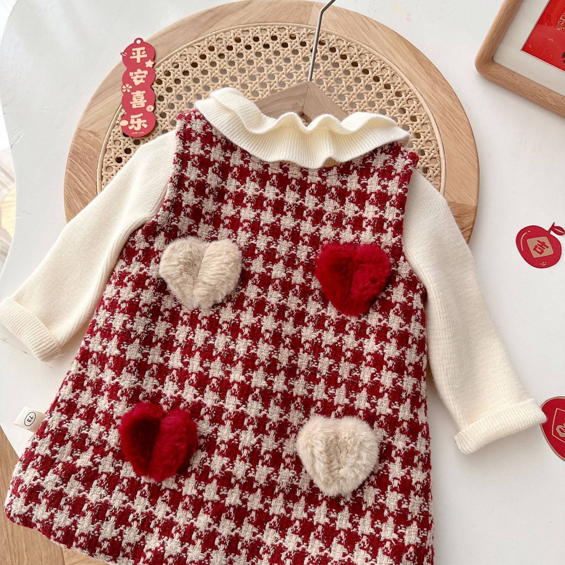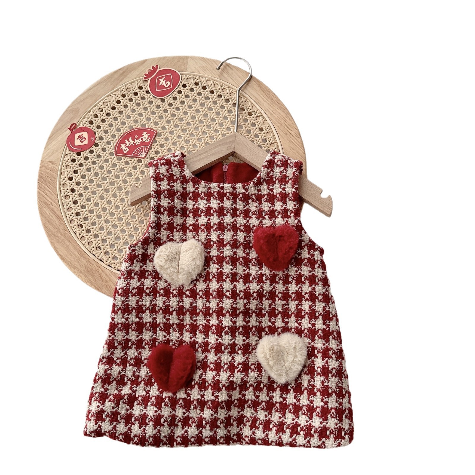 Girls' Fleece-Lined Vest Dress for Winter, Class A, Small Left and Right Baby Thickened Plaid Heart Dress, Children's Dress