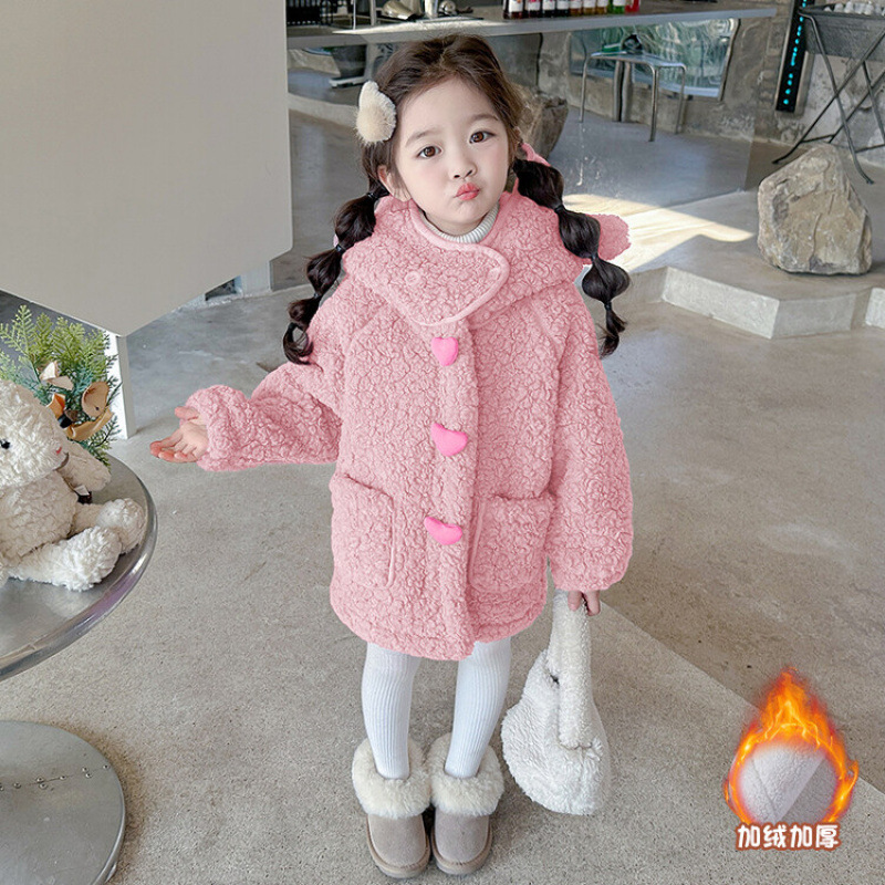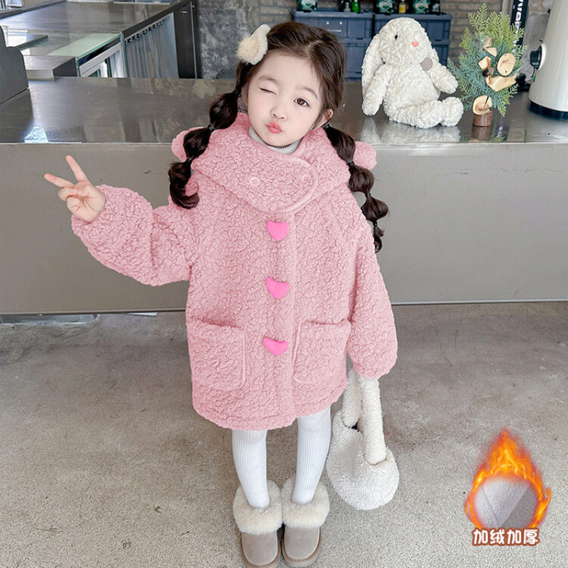 Girls' Heart Woolen Sweater Outwear Autumn and Winter 2025 New Baby Girl's Lamb Wool Winter Velvet Hooded Outwear