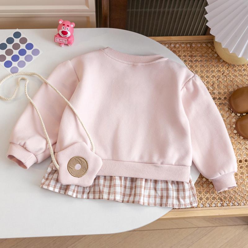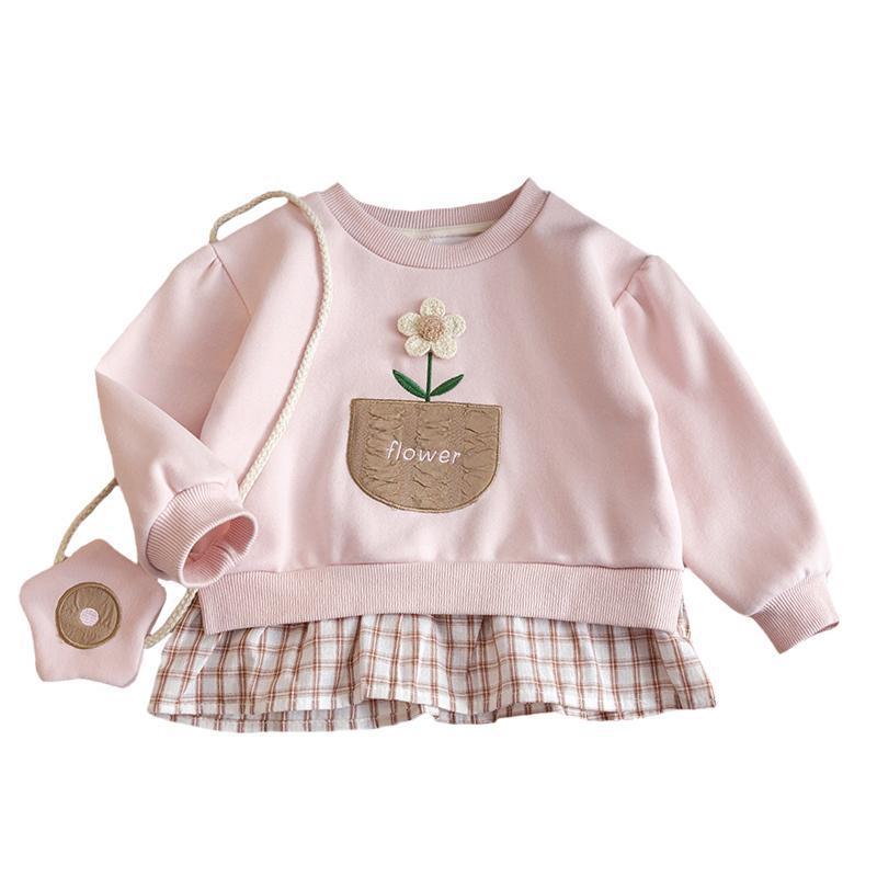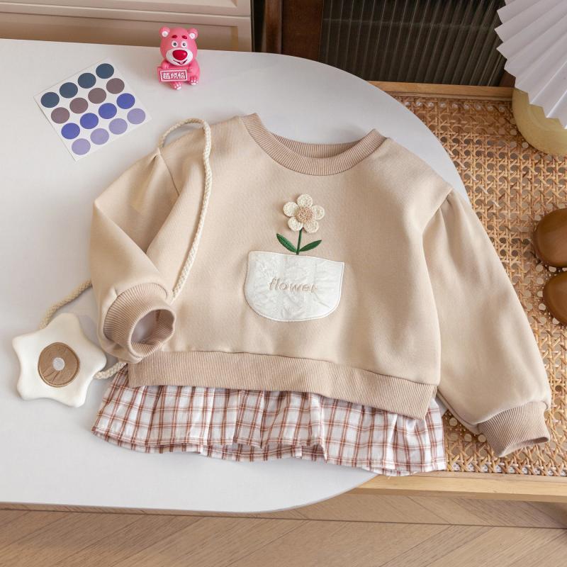 Girls' Spring and Autumn New Sweatshirt Dress Children's Baby Girl Sweet Cute Plaid Flower Little Girl Fake Two-piece Top