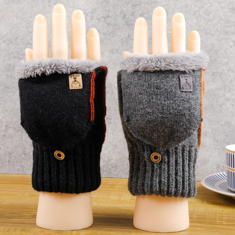 Gloves for Men's Winter Students Writing Flip Cover with Velvet Thickened Northeast Cold-proof Warm Knitted Wool Half-finger Cycling