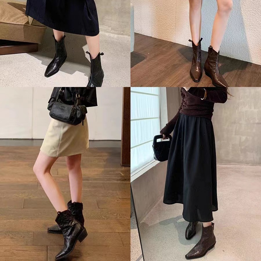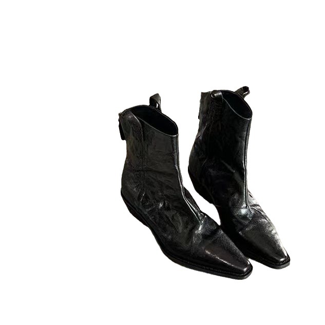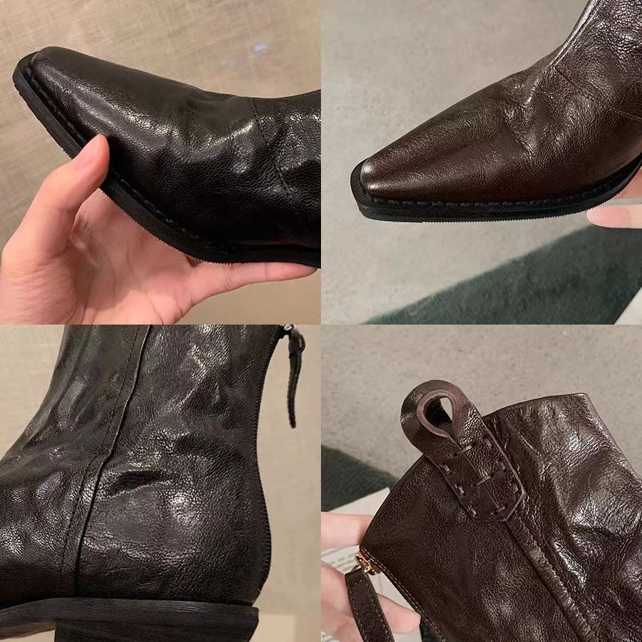 Grape Mom Same Style Fashionable Pointed V-Mouth Vintage Denim Genuine Leather Thin Boots Thick Heel Wrinkle Western Short Boots Women's Autumn