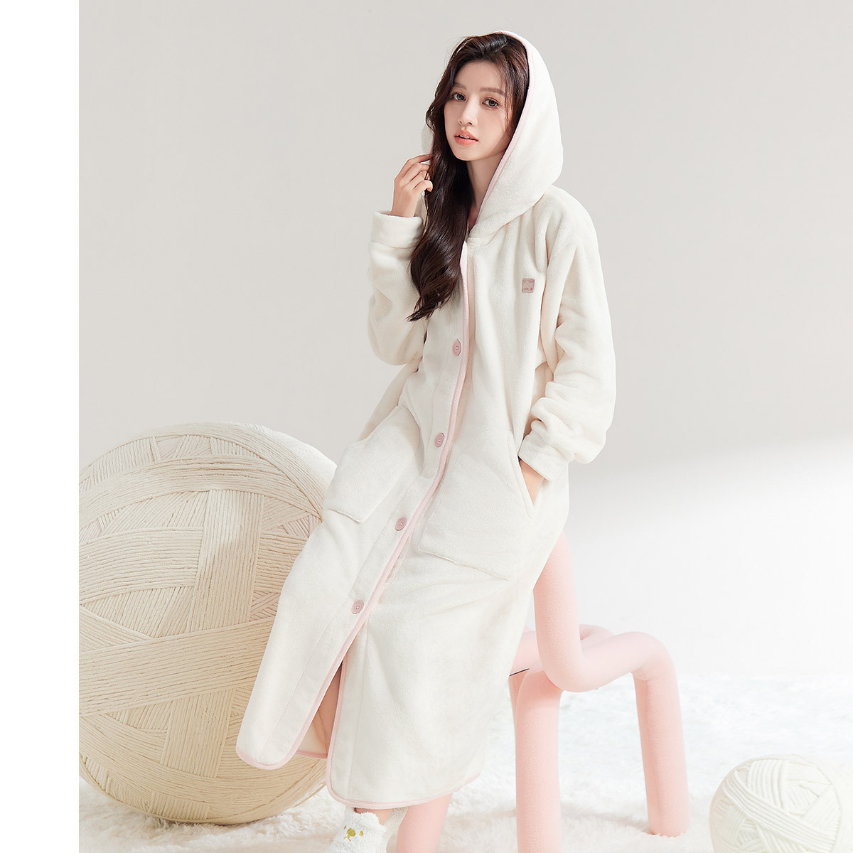 Hooded Nightgown for Girls in Autumn and Winter Thickeneded and Warm 2025 New Flannel Home Wear Bathrobe Long Style