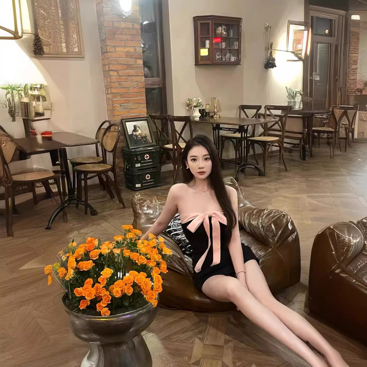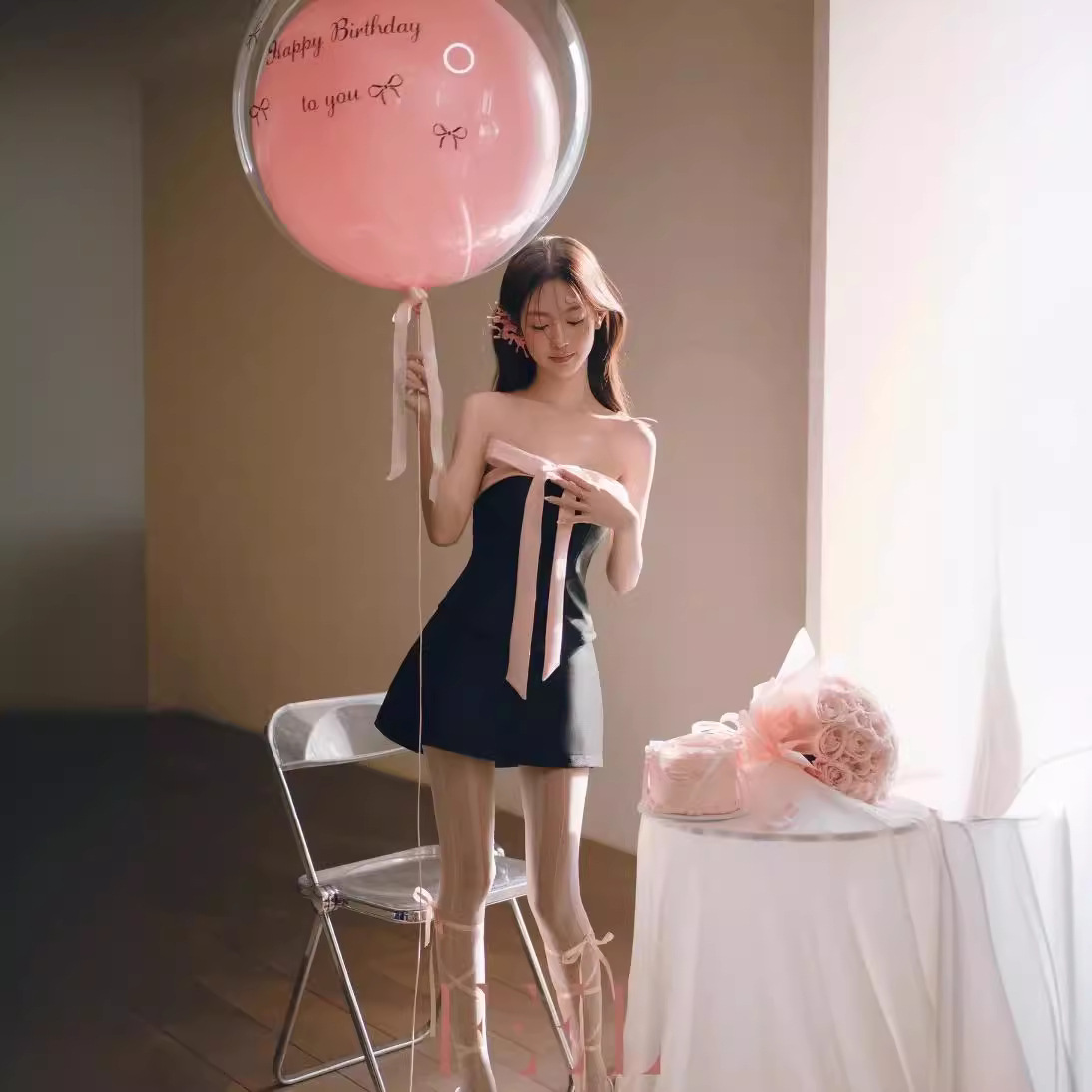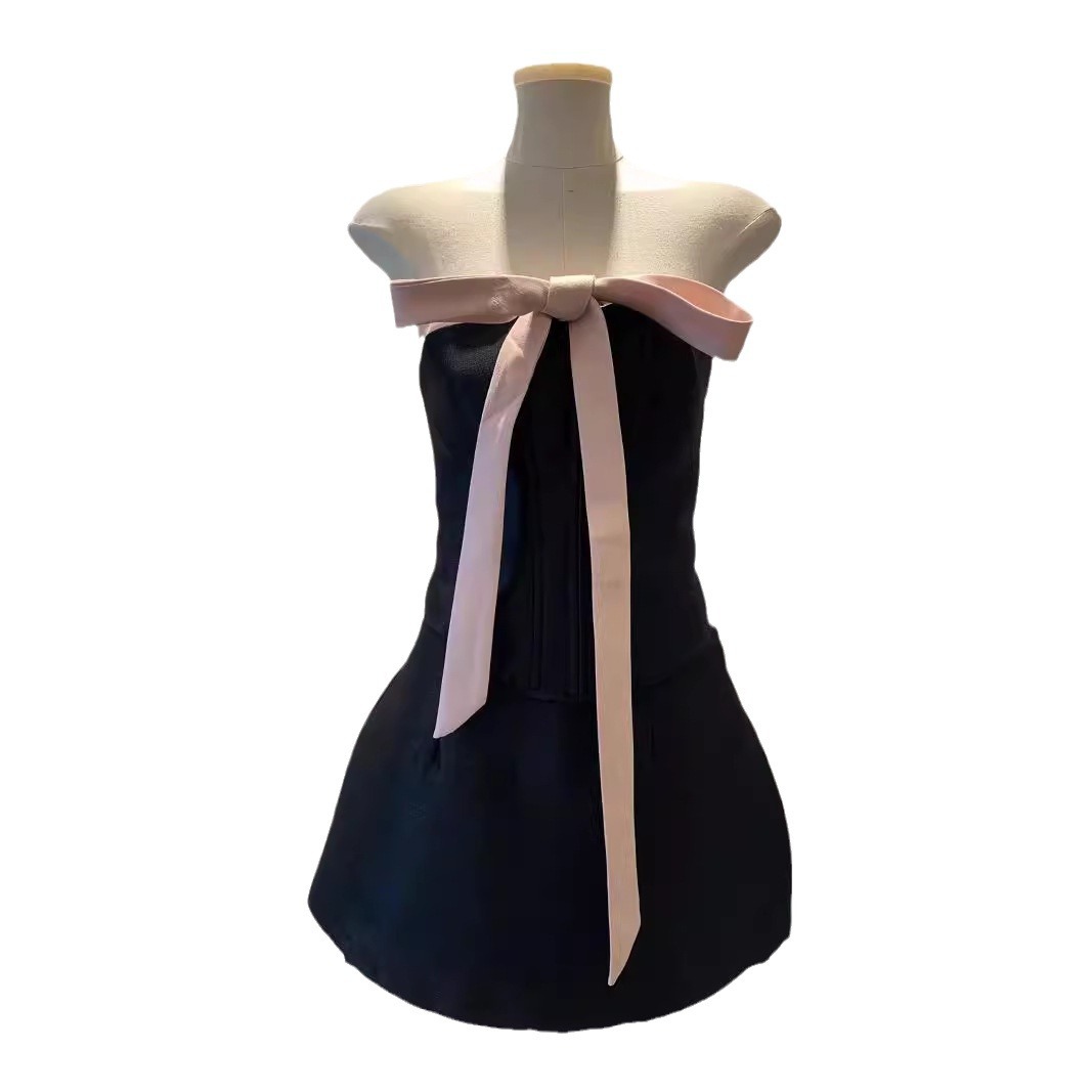 in stock Vietnamese Niche Design Pink Bow Tie Black Strapless Top Flesh-Covering Slimming Skirt Two-Piece Set