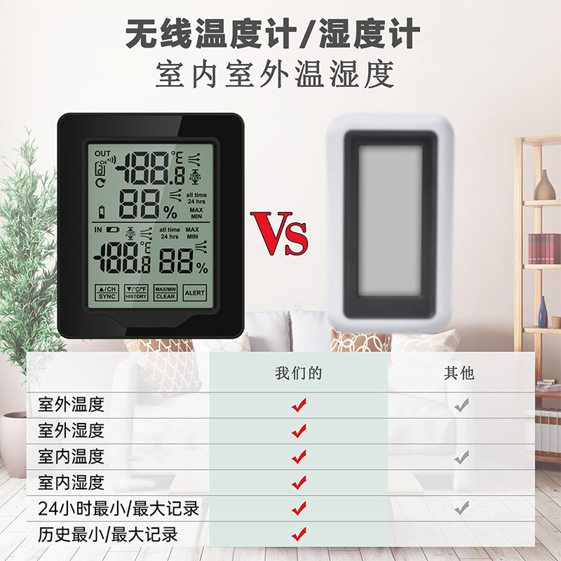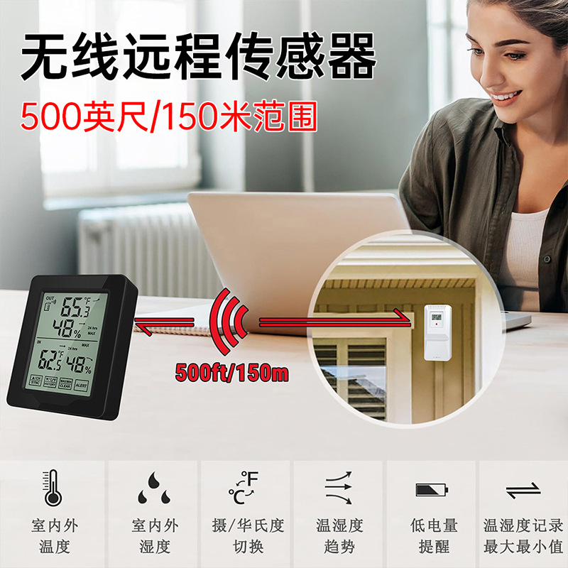 Indoor and outdoor digital electronic temperature and humidity meter wireless long-distance high and low temperature alarm touch screen backlight dual system switch