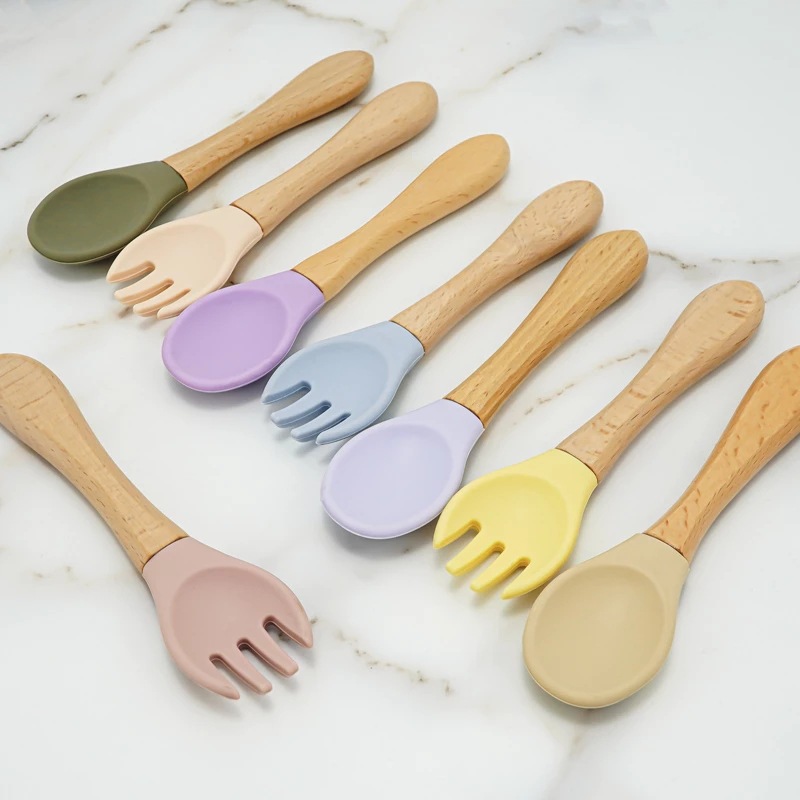 Infant and Child Complementary Feeding Tableware Food Grade Silicone Beech Wood Spoon Fork Children's Wooden Handle Soft Silicone Complementary Feeding Fork and Spoon