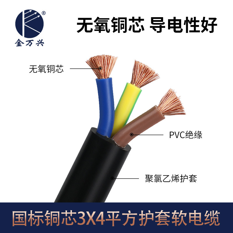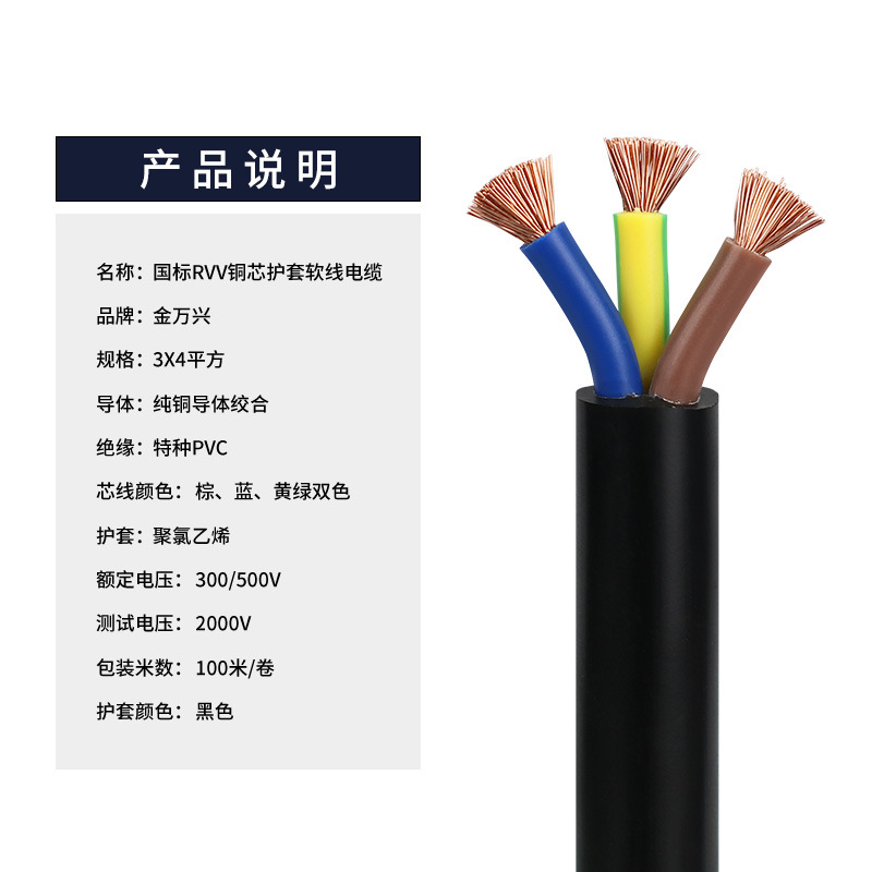 Jinwanxing Rvv Sheathed Wire 3*4 Square Meters National Standard Pure Copper Core Control Power Supply Polyvinyl Sheathed Soft Wire Cable
