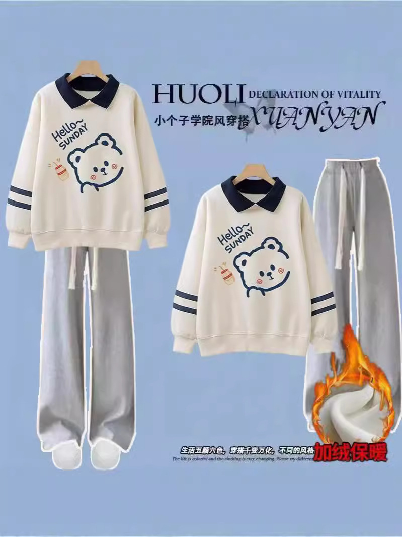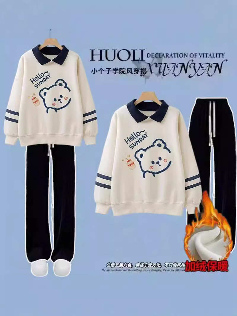 Junior high school students polo collar fleece-lined padded sweater suit autumn and winter girls fashionable sports two-piece set batch