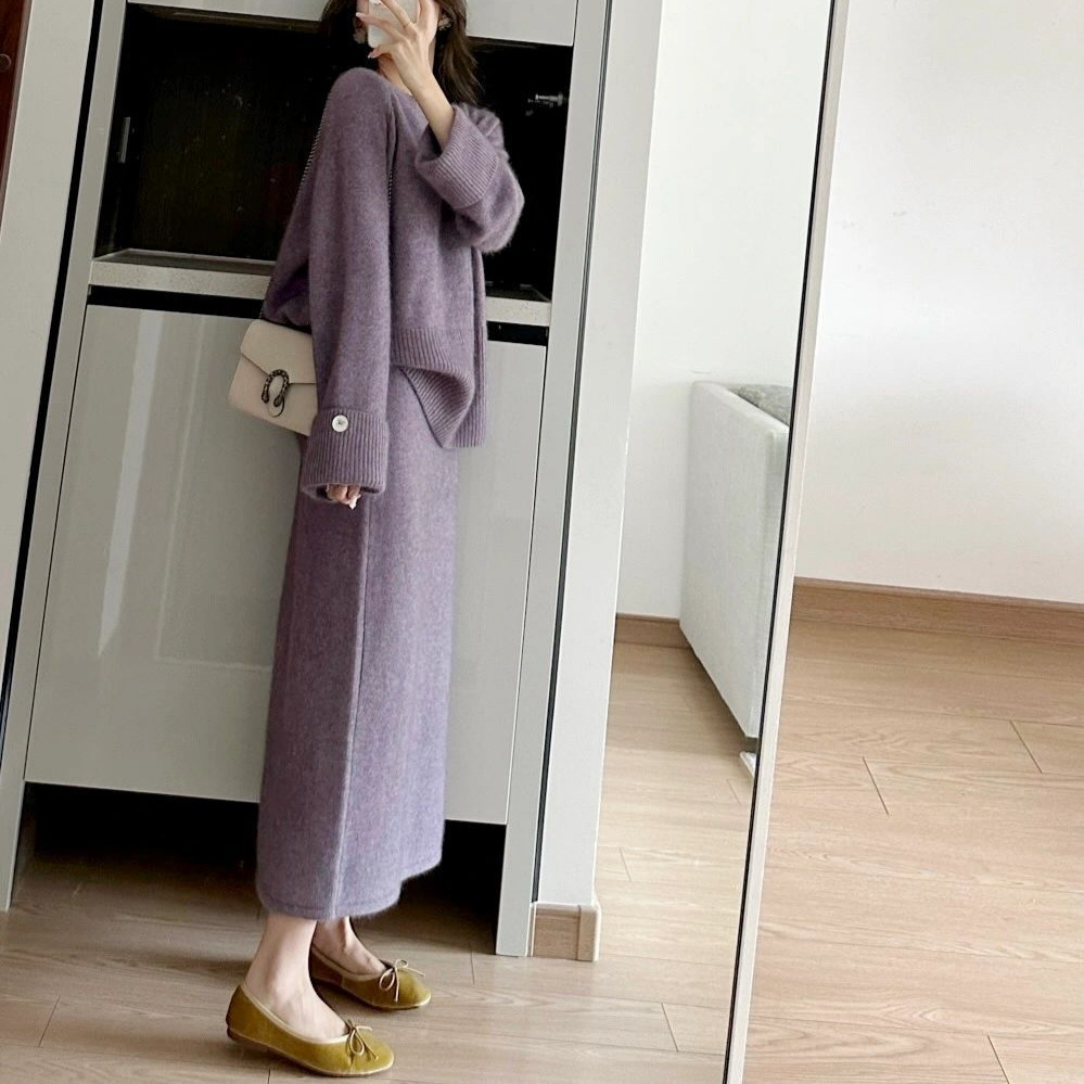 Kaning Fashion Sweater Knitted Skirt Two-Piece Set 2025 Autumn New Purple Pullover Sweater Knitted Suit for Women