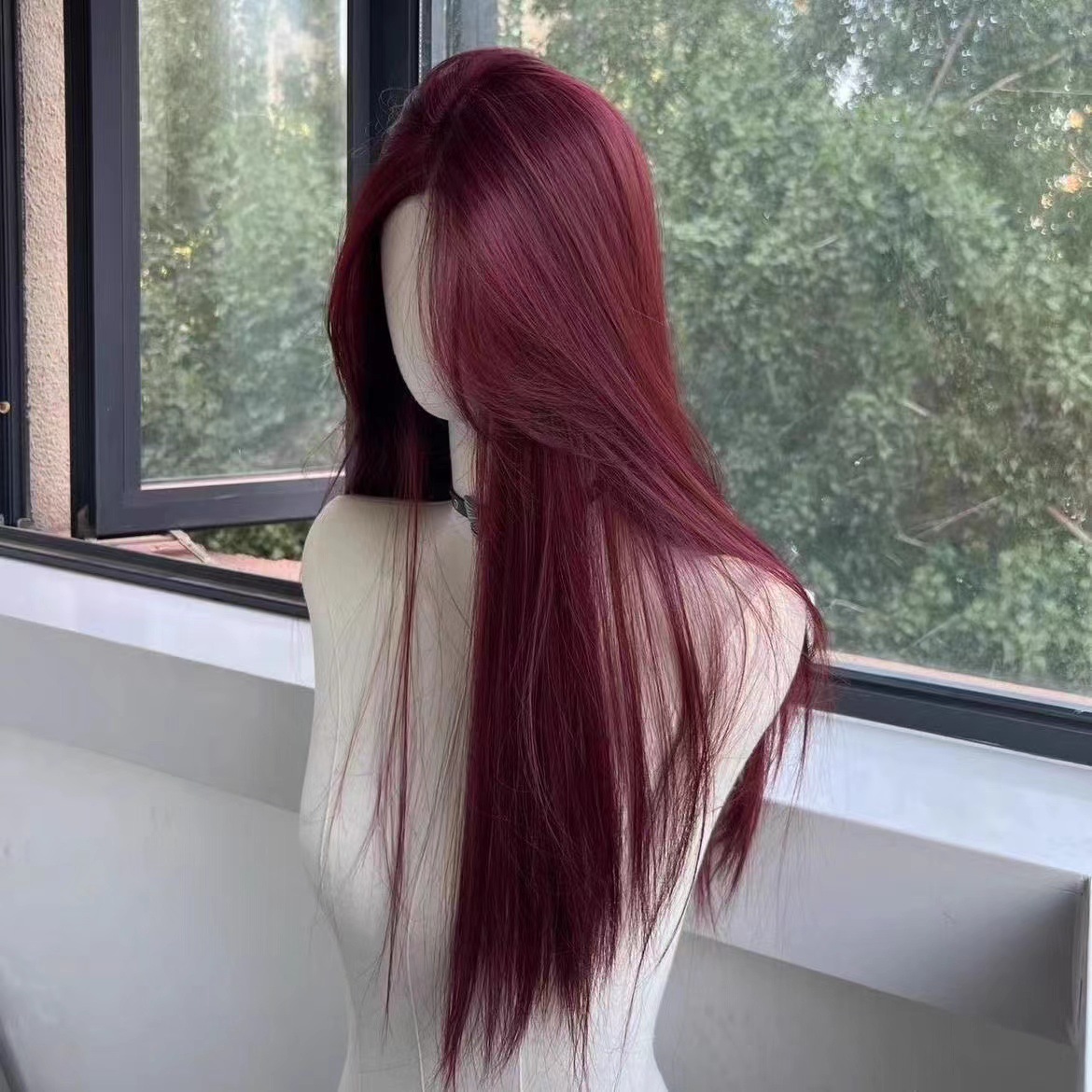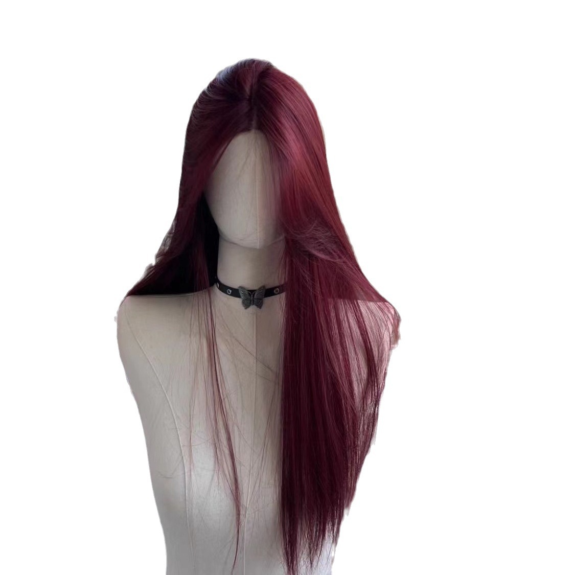 Keni Hand-Woven Forehead Lace Raspberry Red Middle Parted Long Straight Hair French Wig Female Full Headgear Wig Set Thin Section