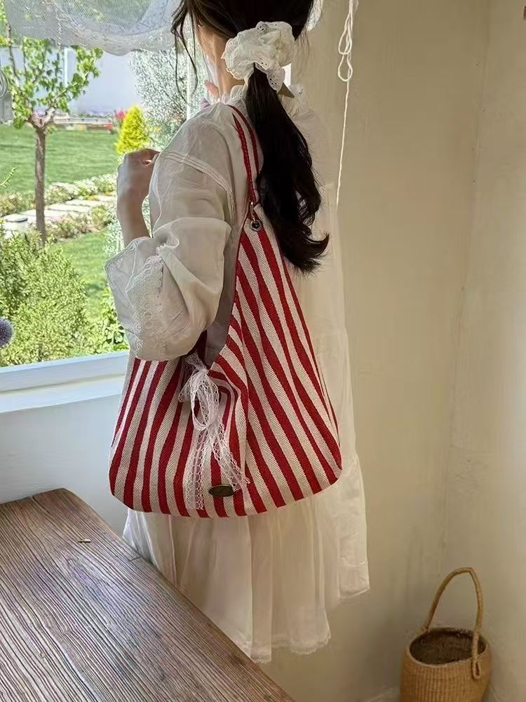 Korean Canvas Bag Women's Reversible Double-Sided Stripesd Large-Capacity Tote Bag Simple Casual Versatile Red Shoulder Bag