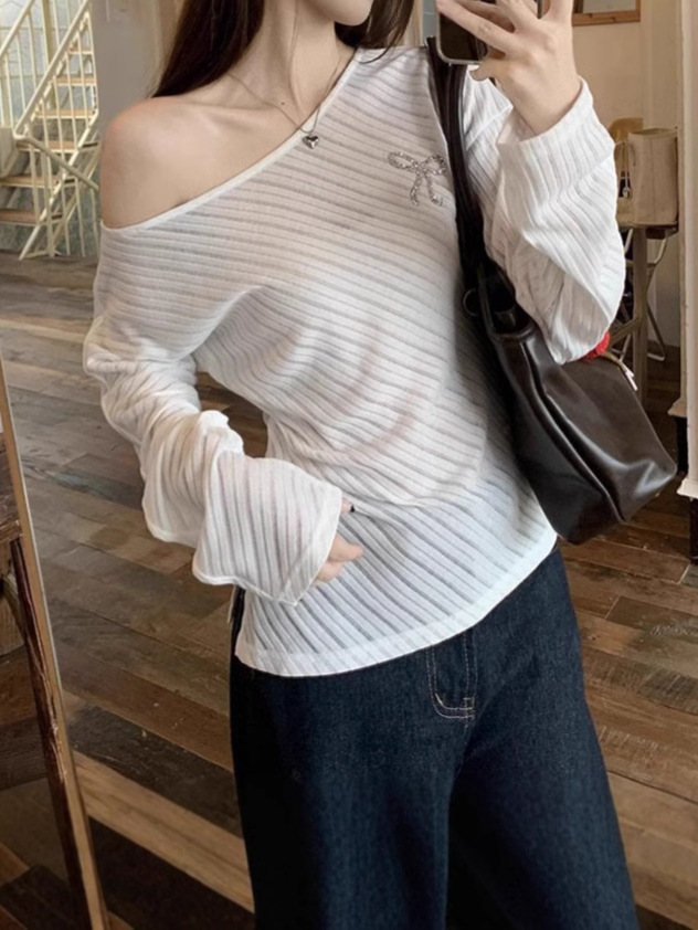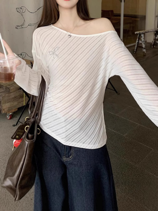 Korean Style Chic Design White Off-Shoulder Long-Sleeved Knitted Base Shirt Women's Early Autumn Sweet Spice Girl Slant Shoulder Beautiful Top