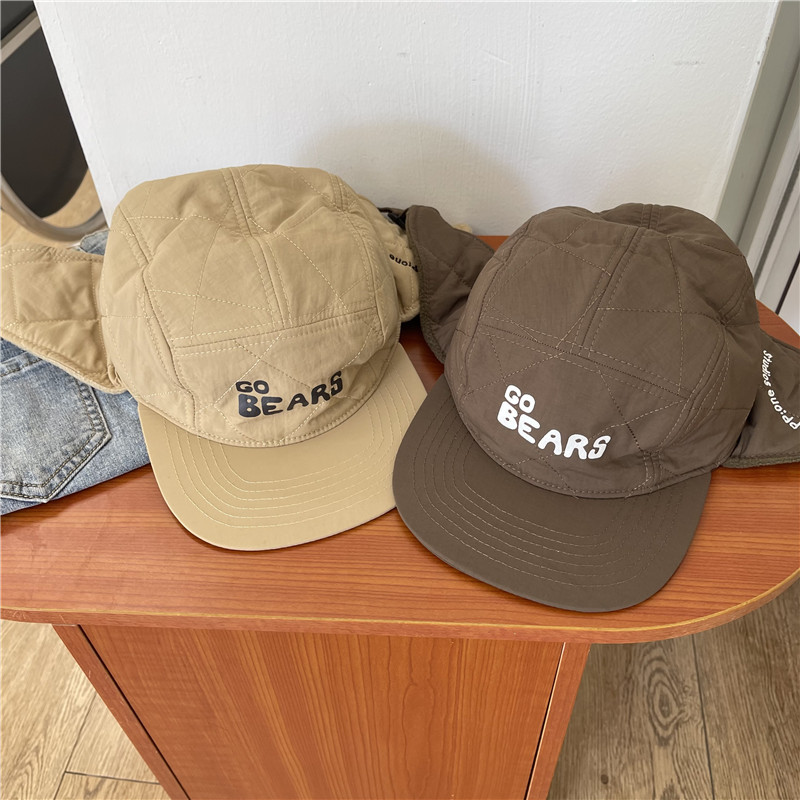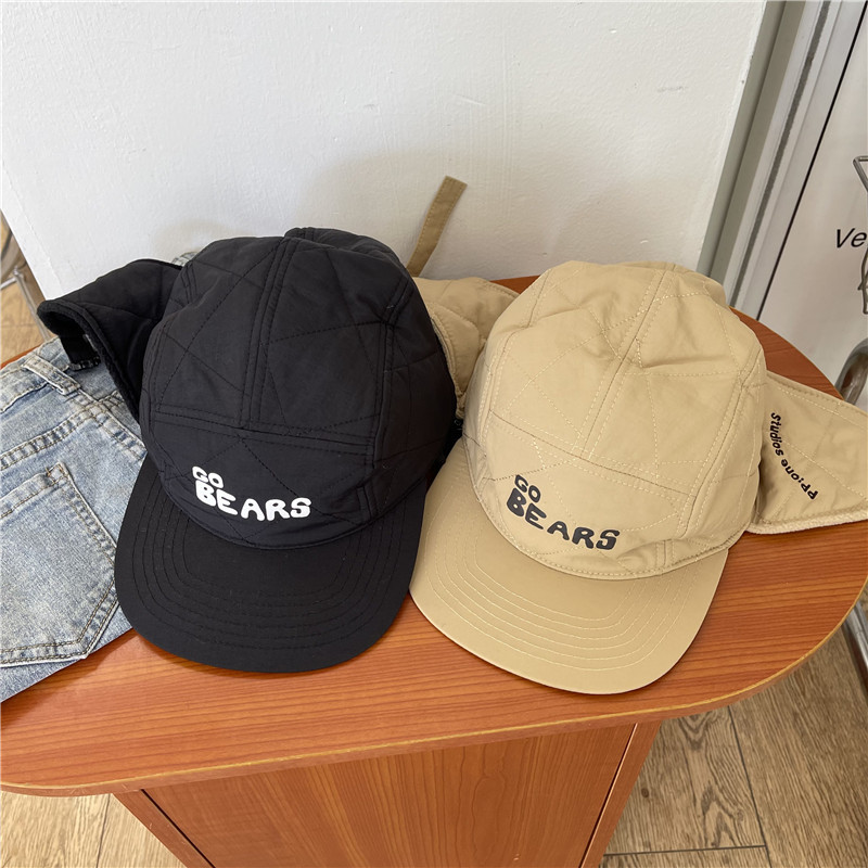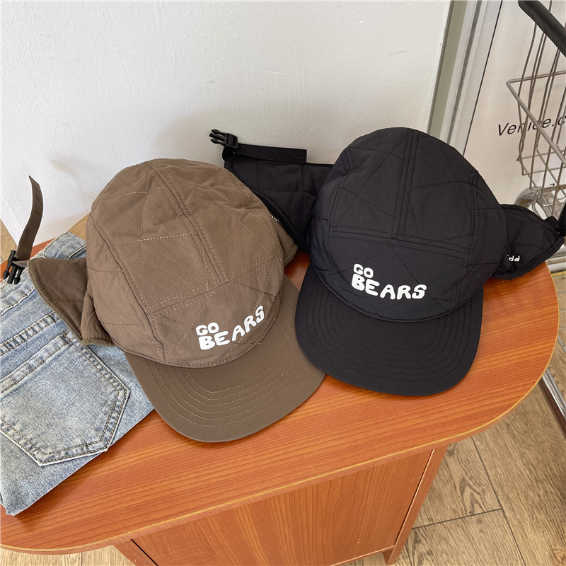 Korean style flat brim letter baseball cap women's all-match men's fleece-lined warm ear protection Lei Feng hat parent-child pilot hat