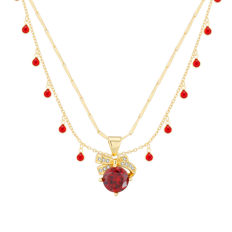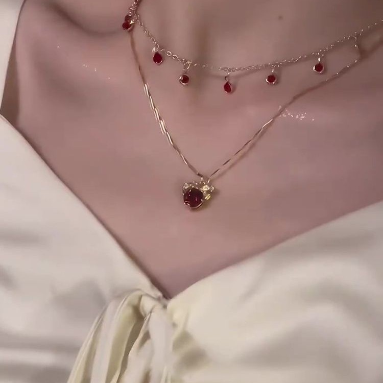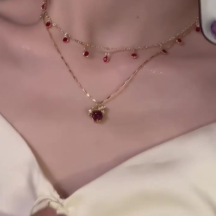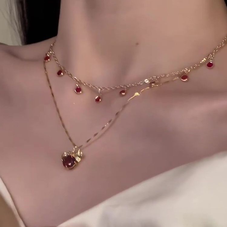 Light Luxury High-end Red Double-layer Flash Diamond Necklace Women's Instagram Style Luxury Pendant French Retro Clavicle Chain