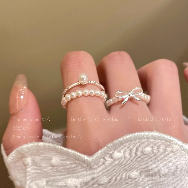 Light Luxury Niche Bow Pearl Ring for Women Korean Style Ins Design Beaded Index Finger Ring Popular Stacked Ring