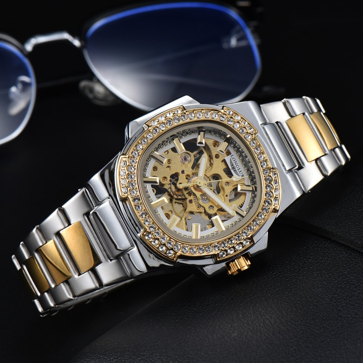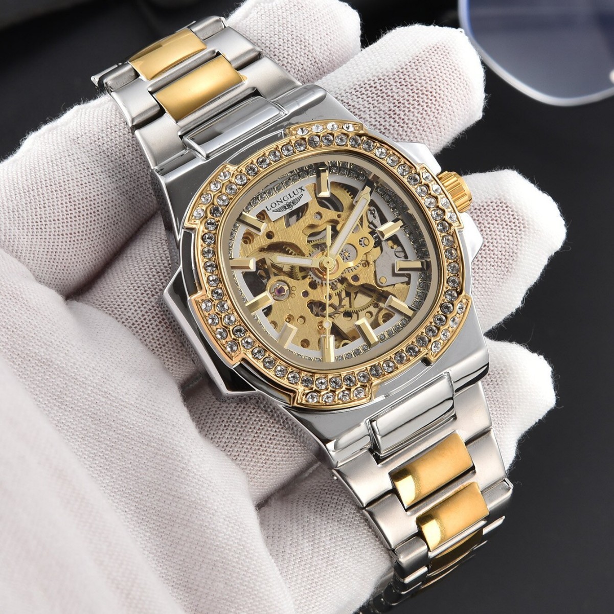 LONGLUX/龙力士自动镂空机械表跨境专用带石仔时髦男女通用钢带表