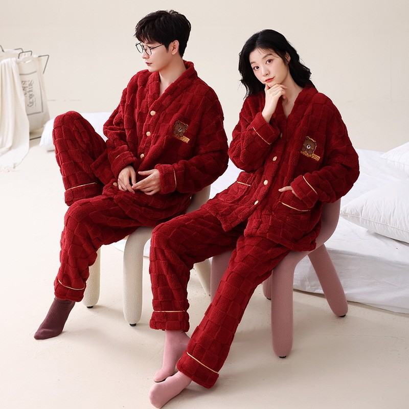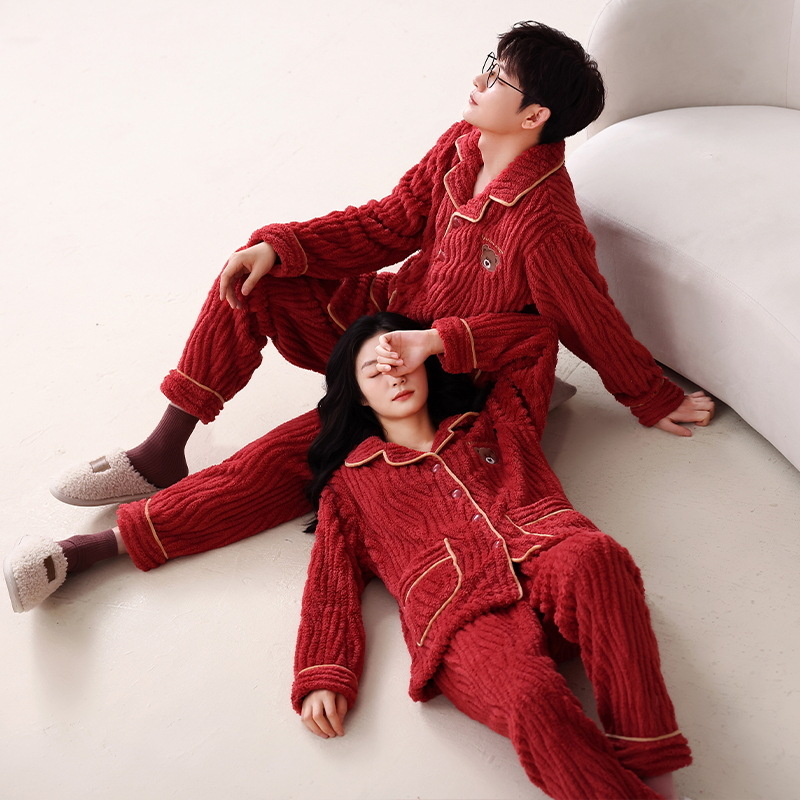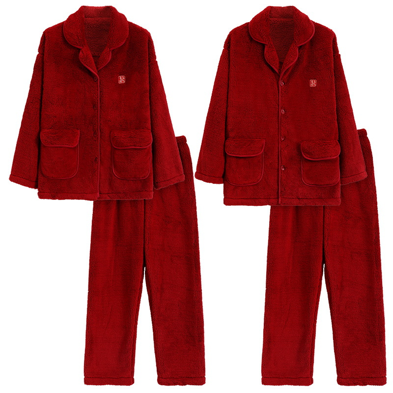 Lushi winter thickened couple coral fleece pajamas suit women's wedding festive birth year Big Red homewear men