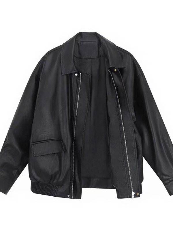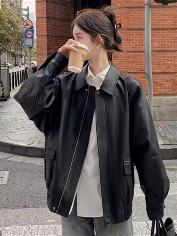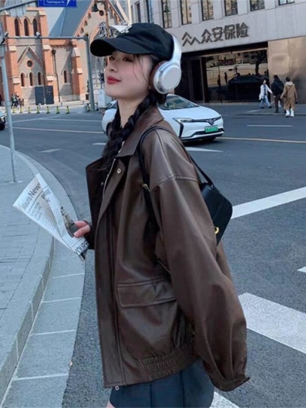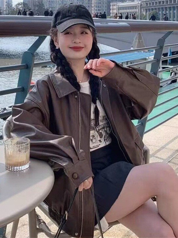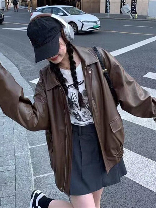 Maillard Leather Coat American Sweet Cool Wear Brown Leather Coat Windproof Loose American Vintage Biker Jacket