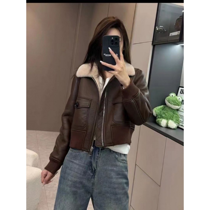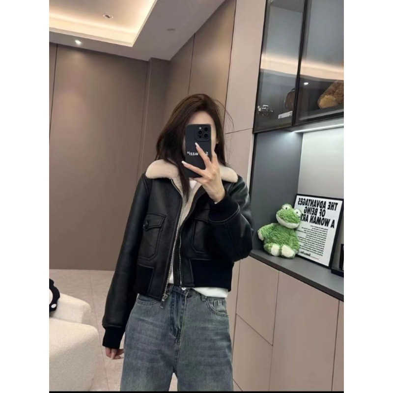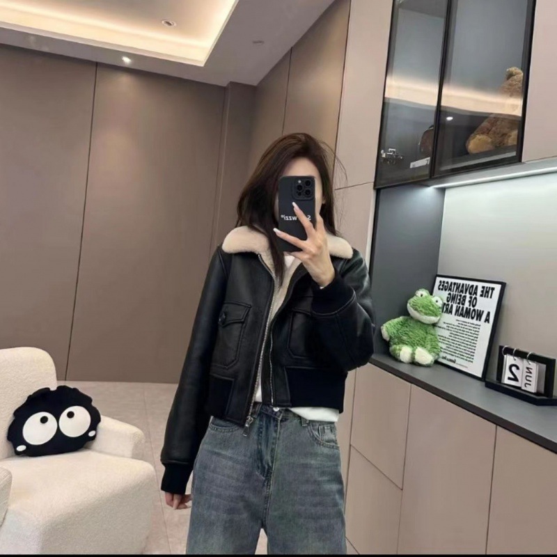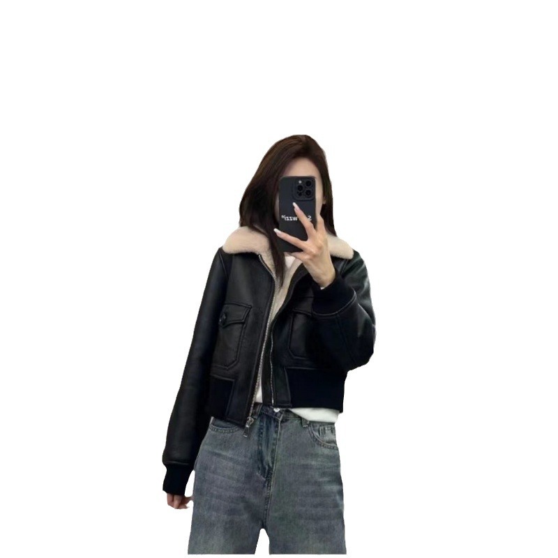 Maillard Winter Short Leather Fashion Stylish Petite Thickened Biker Leather Jacket Women Lamb Wool Jacket