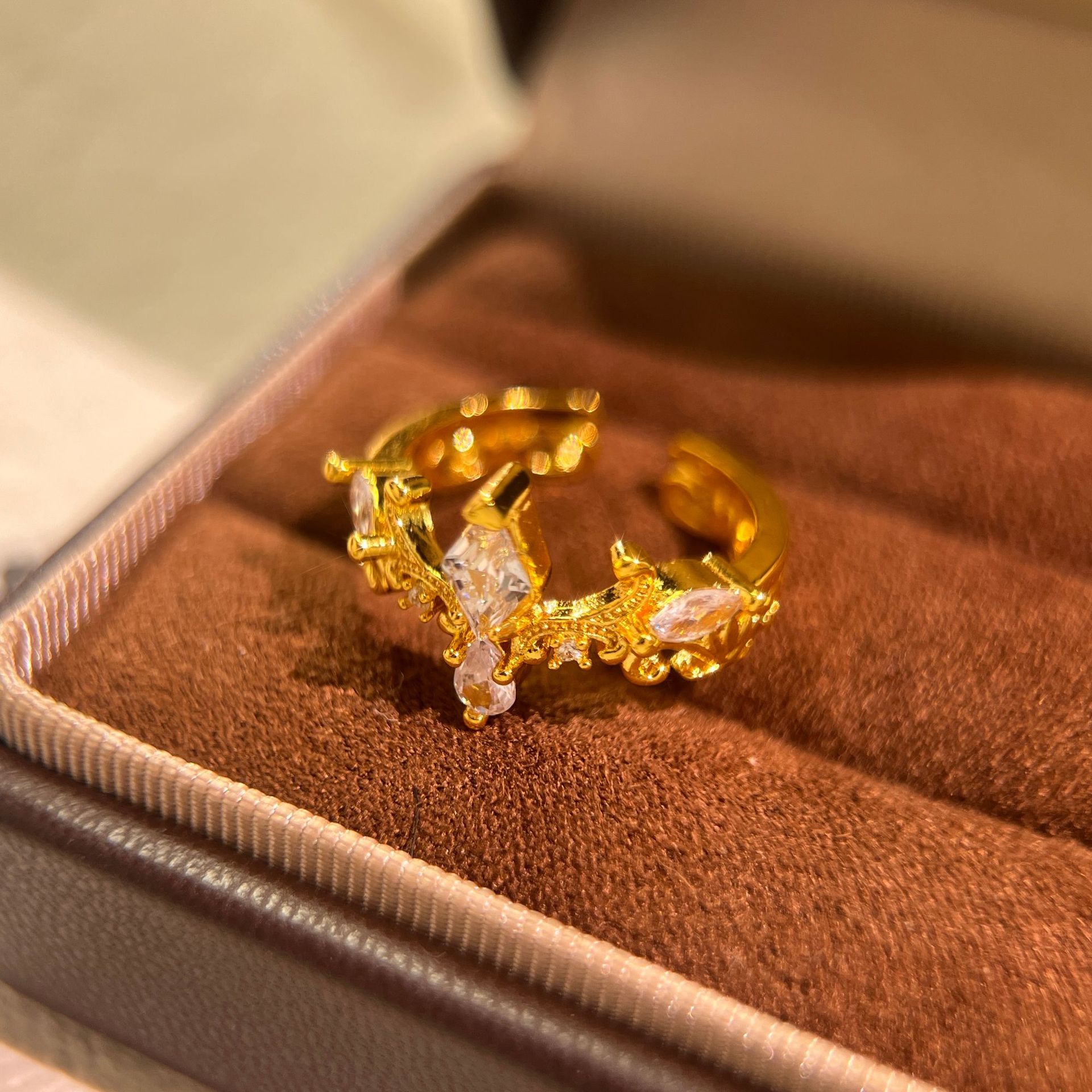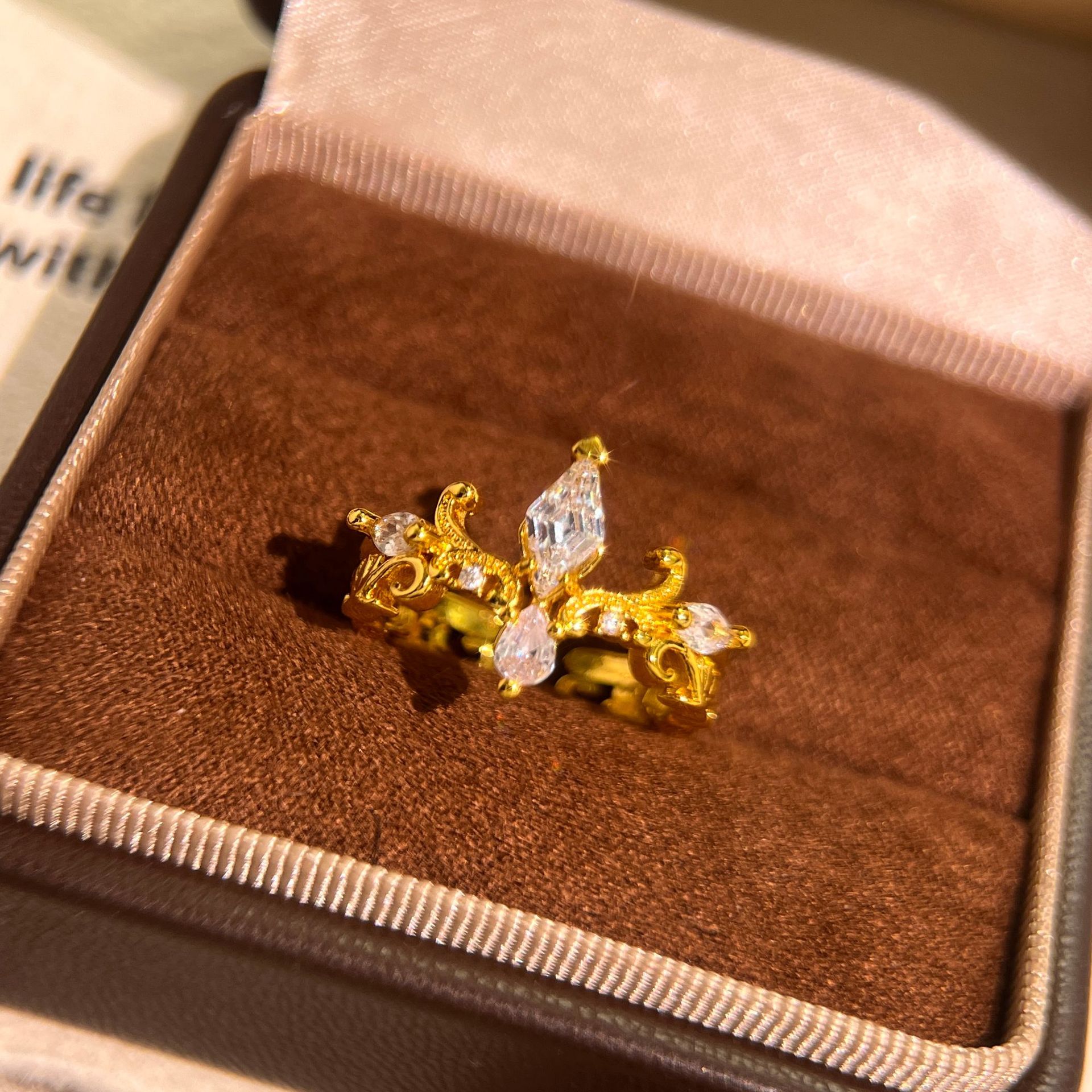 Medieval Style Exquisite Blue Tears Sparkling Diamond Crown Engagement Ring for Women Retro Palace Style Open Gold-Plated Index Finger Ring