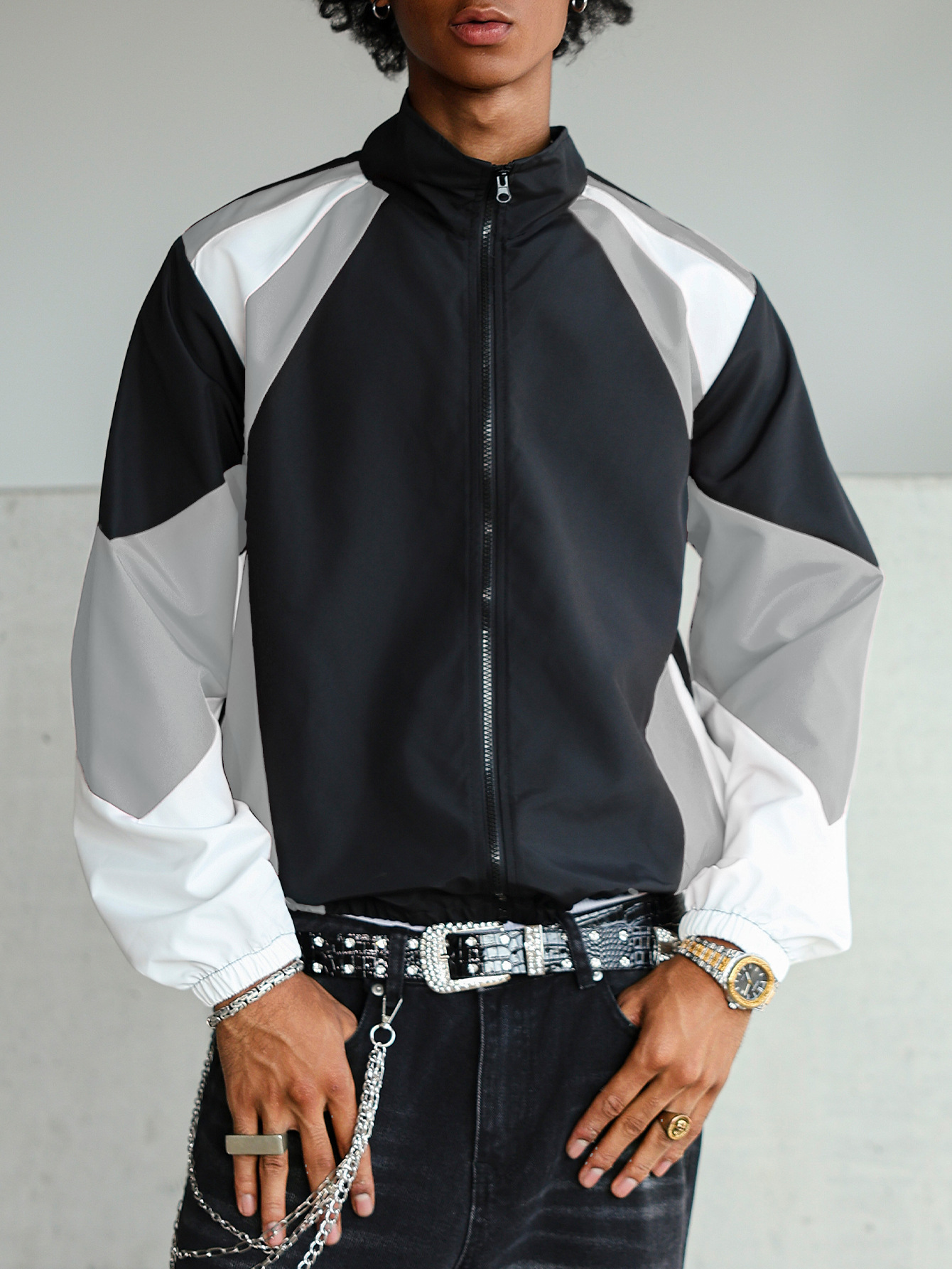Men's Color Patchwork Zipper Jacket, Regular Fit Long Sleeve Casual Outerwear for Spring and Fall,