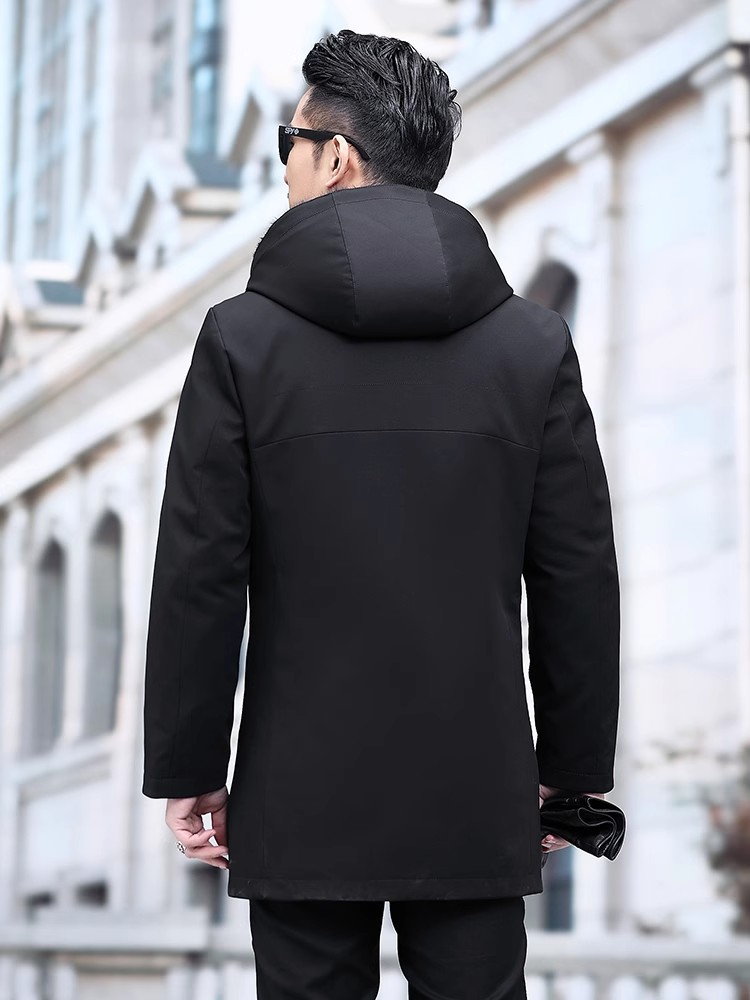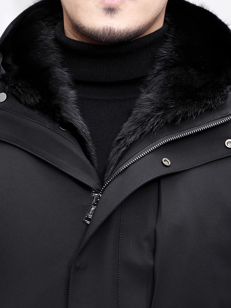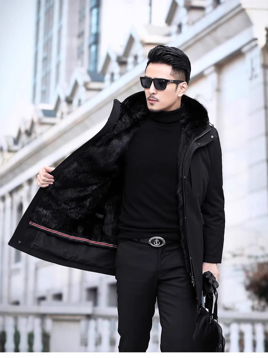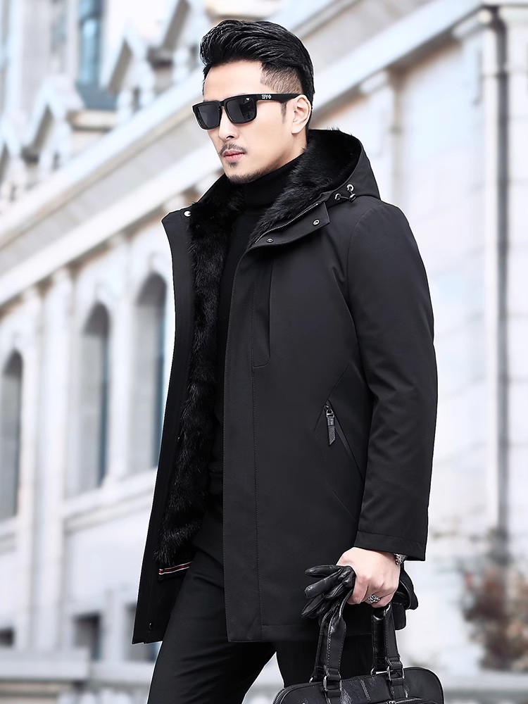 Men's Mid-Length Mink Parka with Hooded Fur Coat, Suitable for Winter Business Attire