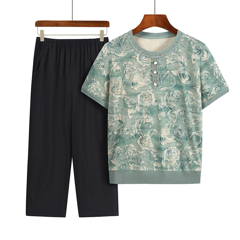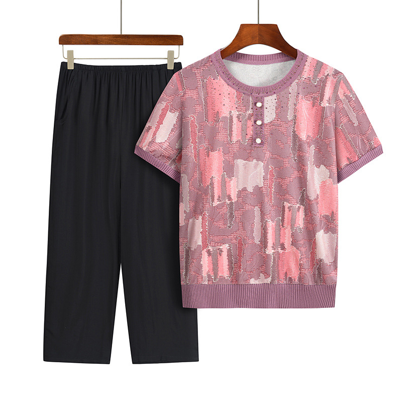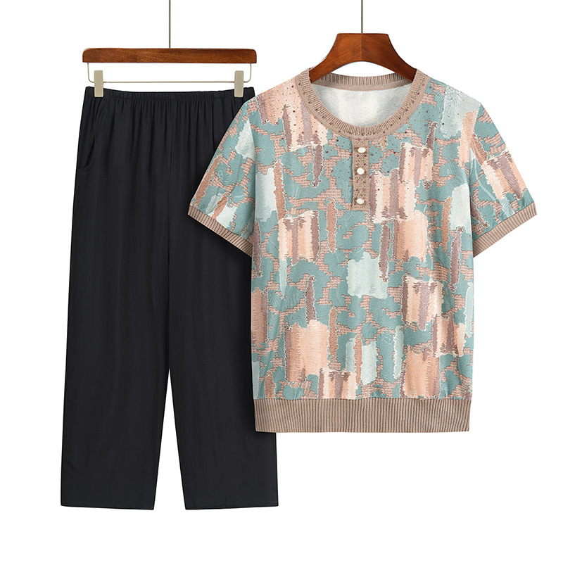Middle-Aged and Elderly Women 50 Years Old Summer Knitted Knitwear Short-Sleeved New Top 2023 Mother's Wear Loose Casual Two-Piece Set
