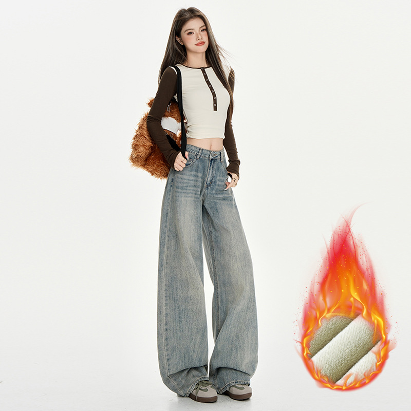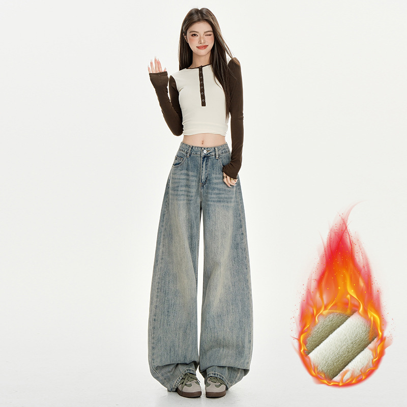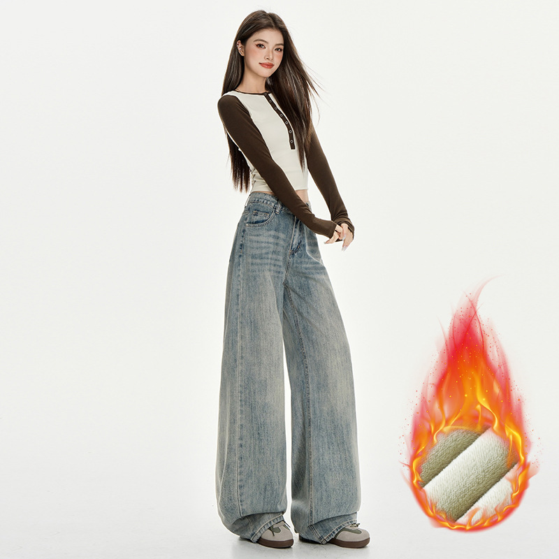 Mu Hanshe 2025 American Wide-Leg Denim Women's Autumn and Winter Velvet Narrow Straight Blue Pants for Women