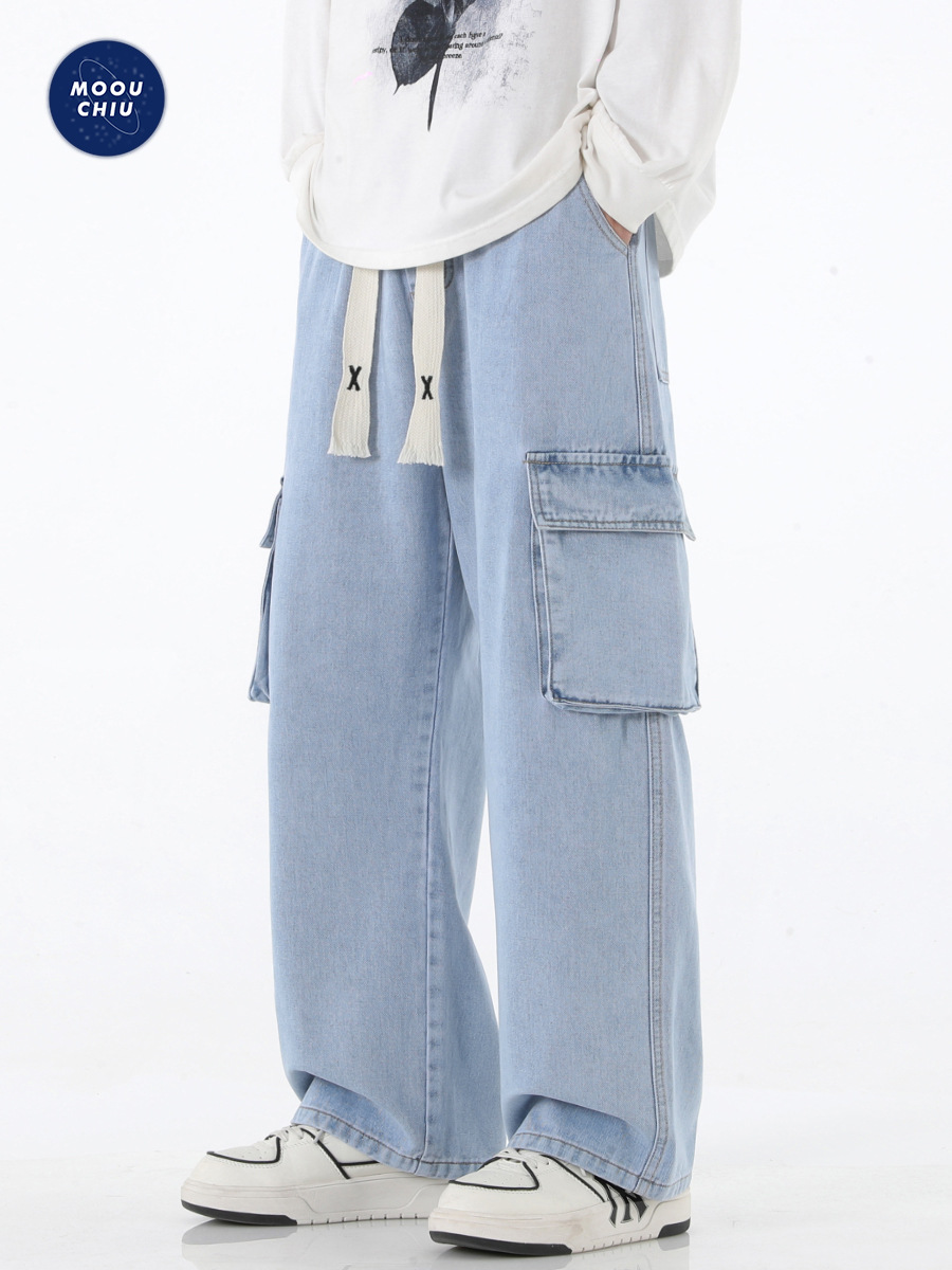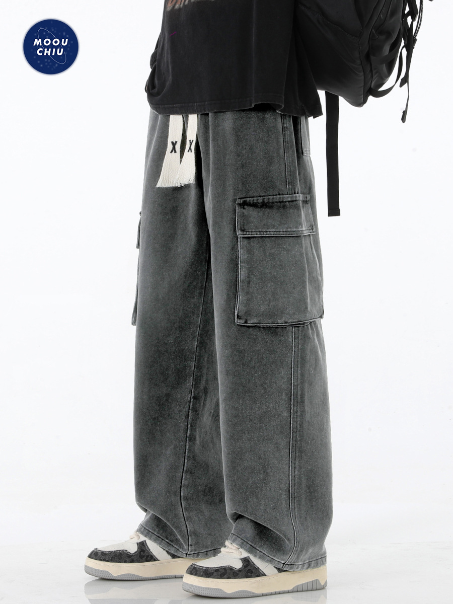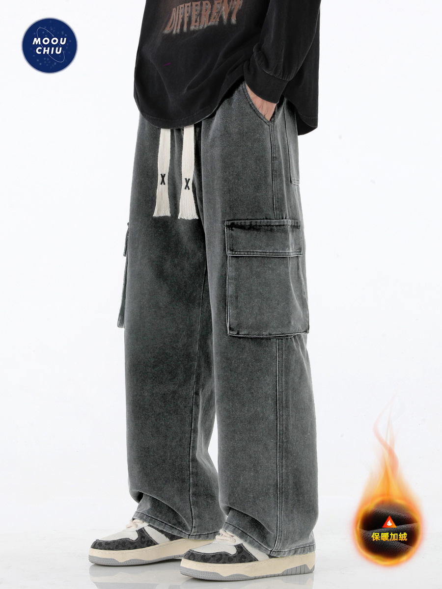 Muciu Men's Clothing | Fleece-Lined and Thickened Washed Smoke Gray Workwear Jeans for Men, Loose Straight-Leg Multi-Pocket Wide-Leg Pants