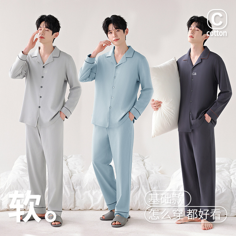 New A-Class Pure Cotton Pajamas for Women, Spring and Autumn Long-Sleeved Long Pants, Solid Color Men's Turn-Down Collar Cardigan with Buttons, Couple's Loungewear