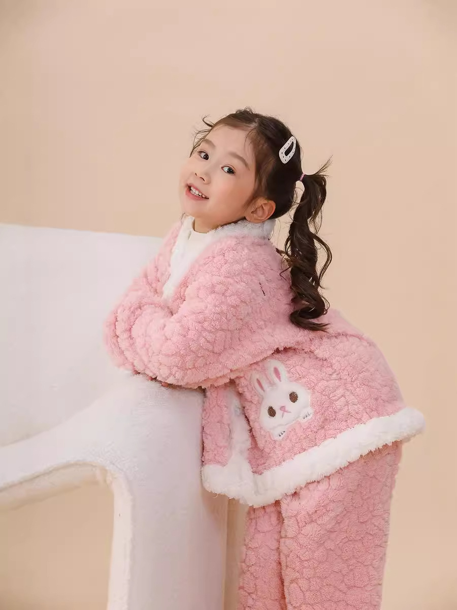 New Children's Home Clothes Cardigan Women's Pajamas Set New Soft Waxy Jacquard Loose Flannel Men's Suit
