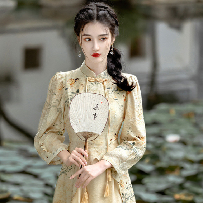 New Chinese-style Buckle Cheongsam dress Women's Spring and Autumn New National Style Vintage Improved Dress Tight Waist Long Dress