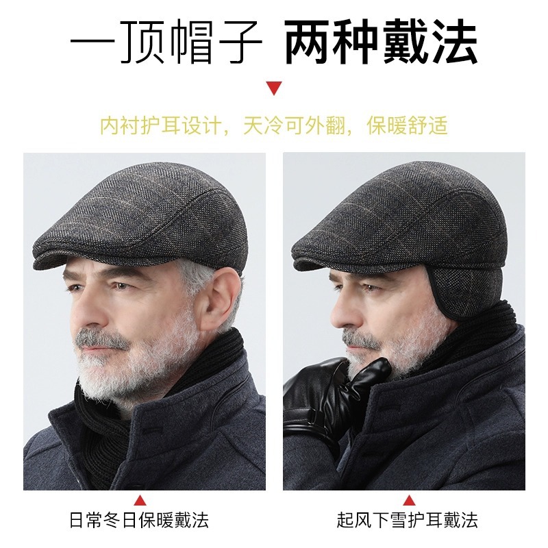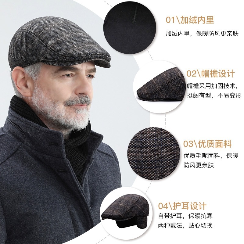 New Dad Grandpa Forward Hat for Middle-aged and Elderly Men's Retro British Plaid Warm Ear Protection Beret