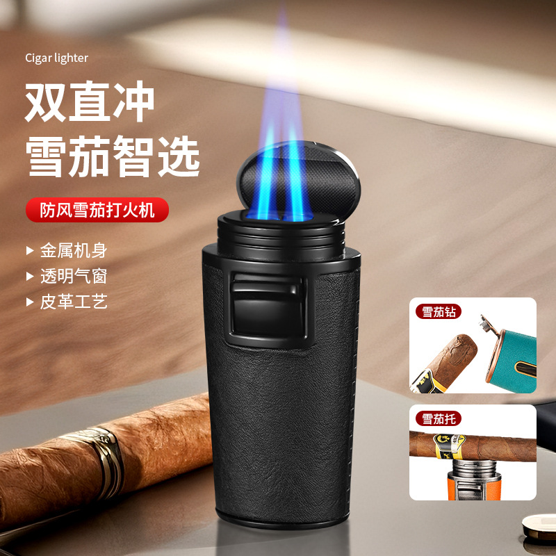 New Leather-Textured Metal Straight-Through Lighter Creative Men's Blue Flame Windproof High-Power Cigar Lighter Foreign Trade Wholesale