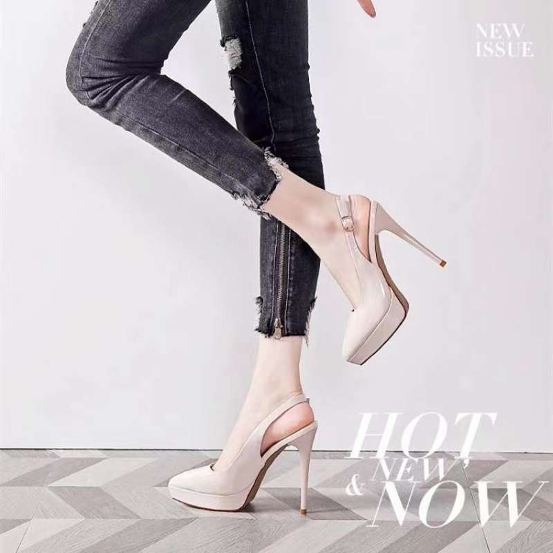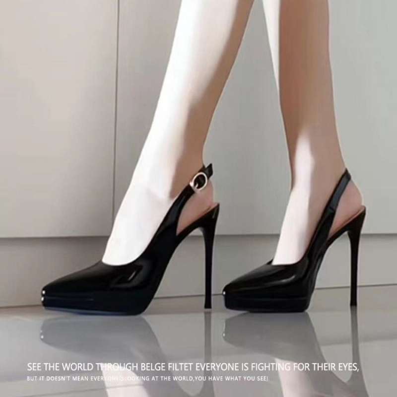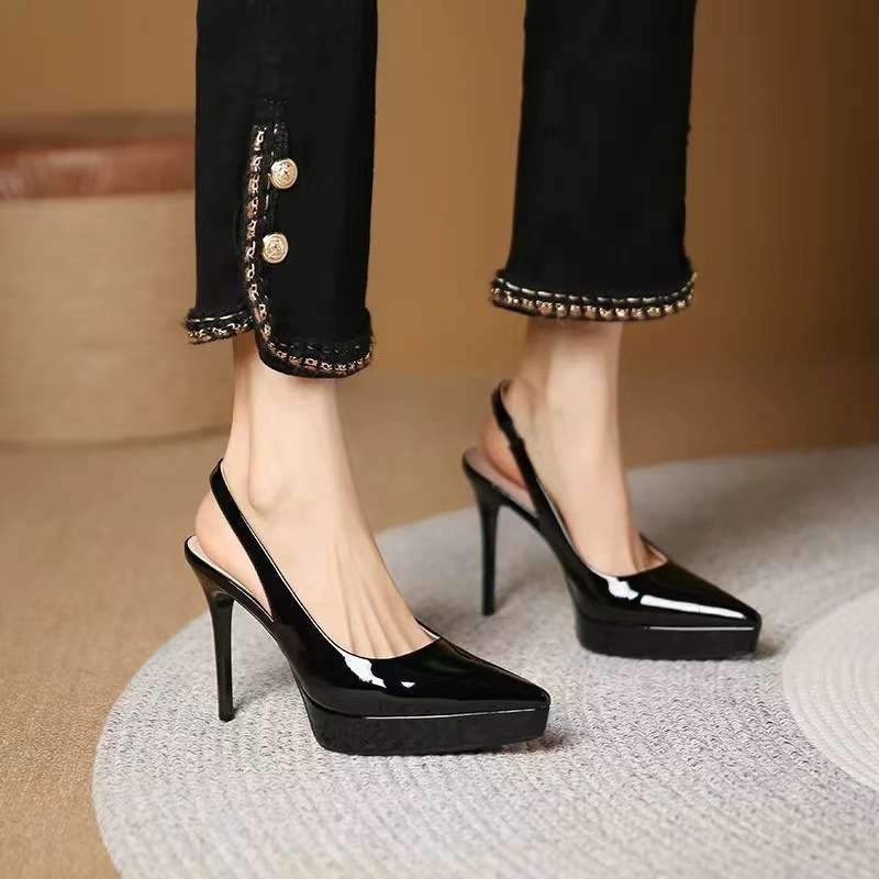 New Sexy Waterproof Platform High Heels Women's Baotou Thin Heel Rear Empty Shoes 8cm Patent Leather Pointed Rear Trip Strap Shoes