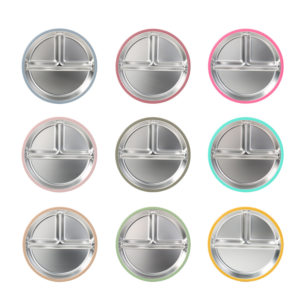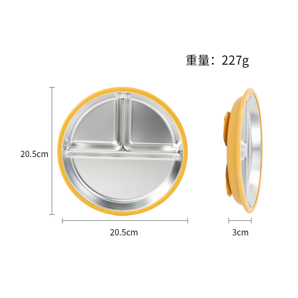 New silicone 304 stainless steel plate diameter 20cm with 4 suction cups baby silicone feeding tableware suit