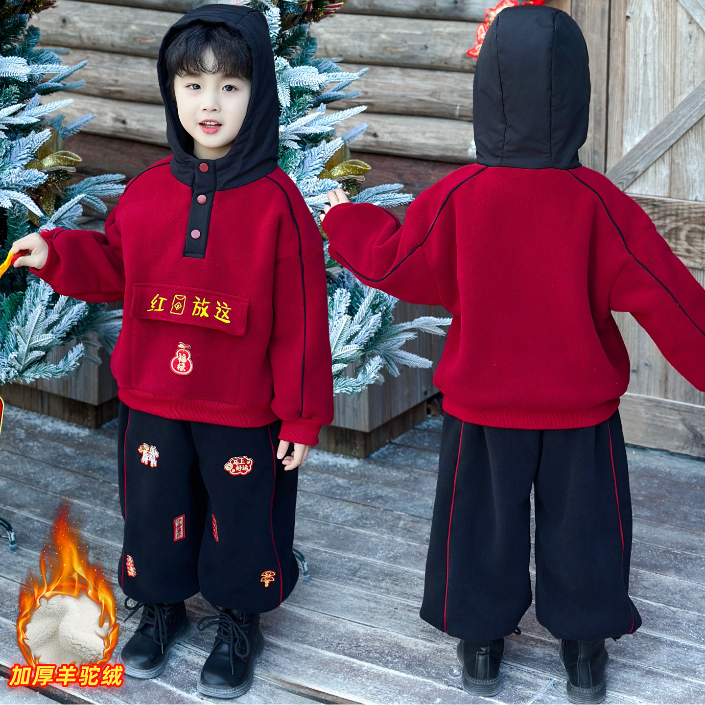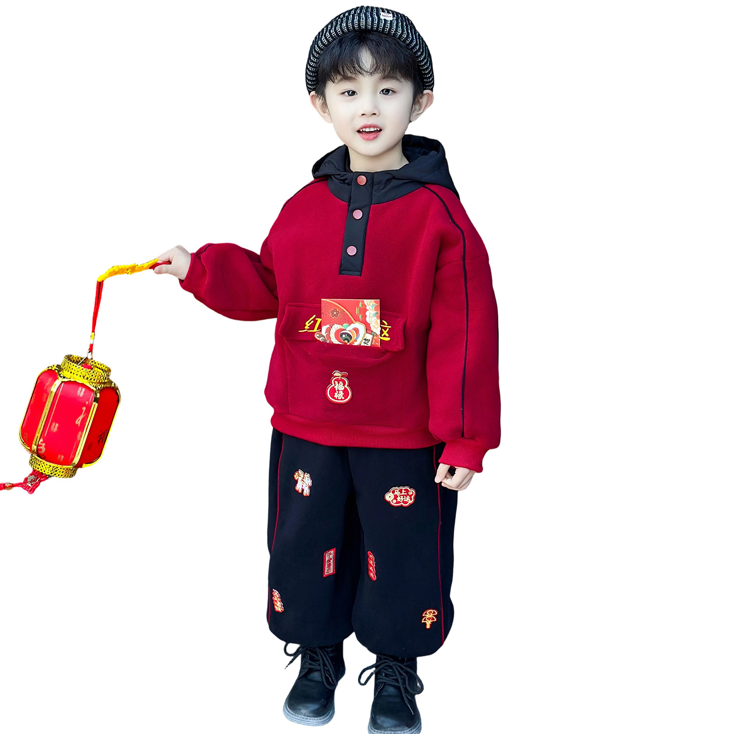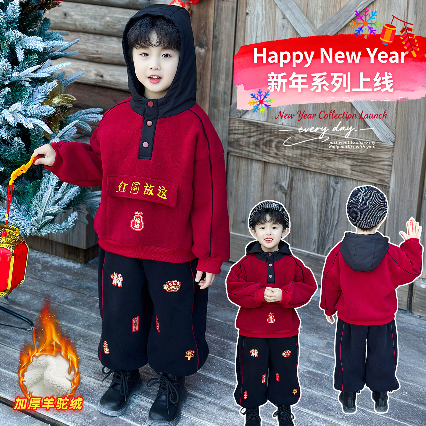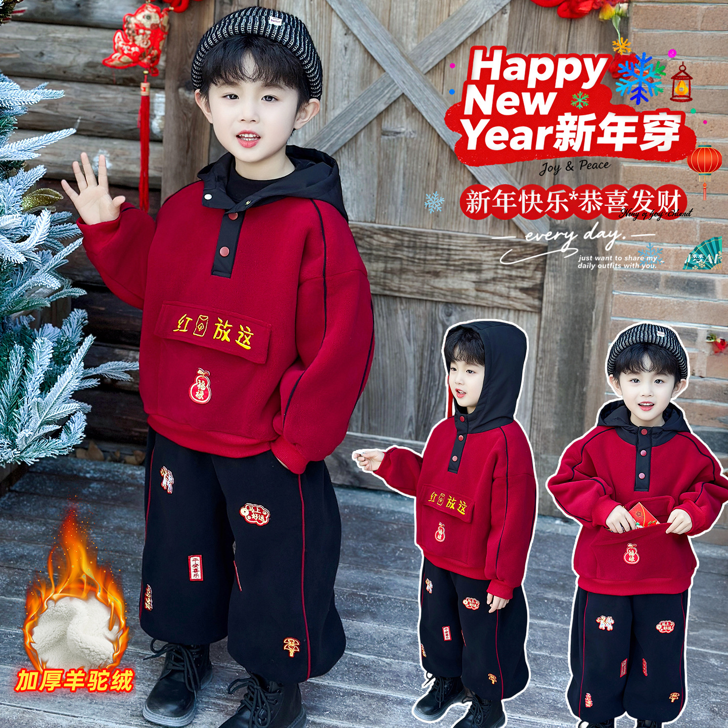 New Year's Greetings Suit for Boys Fleece-Lined Suit Winter 2025 New Kidsren's Clothing Festive New Year's Clothing Boy's Sweatshirt Two-Piece Set