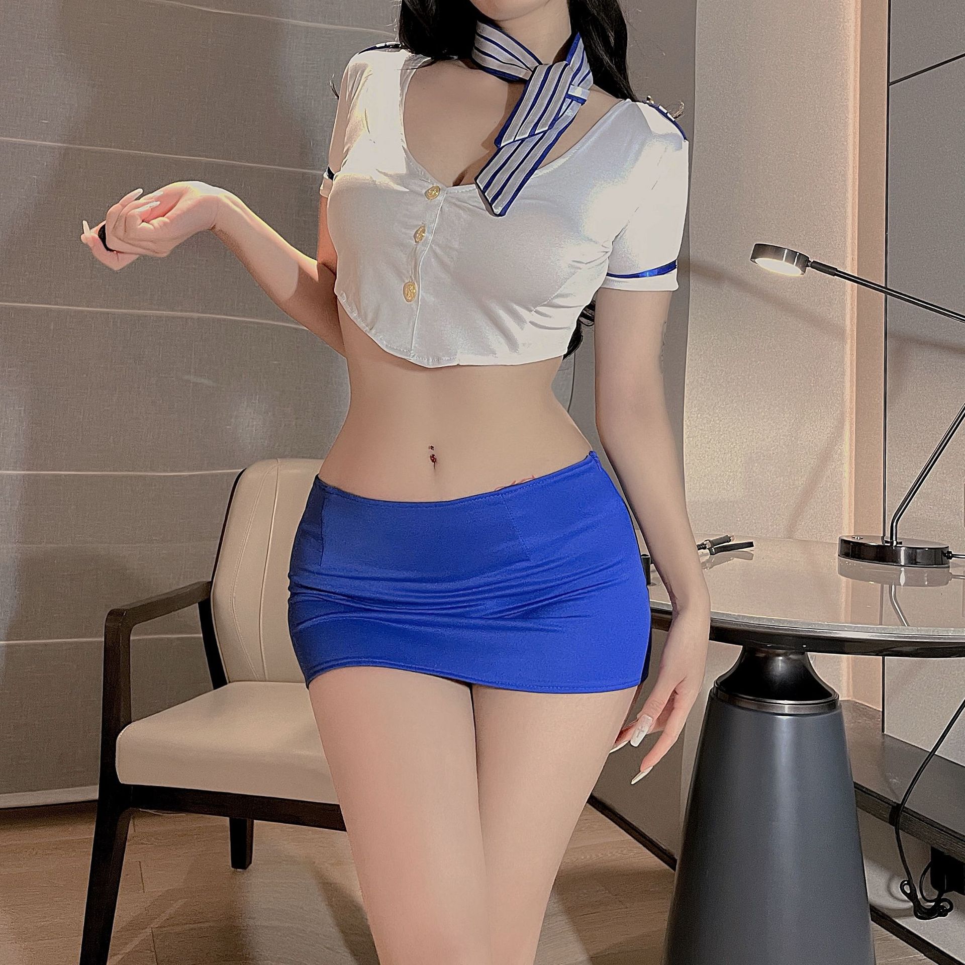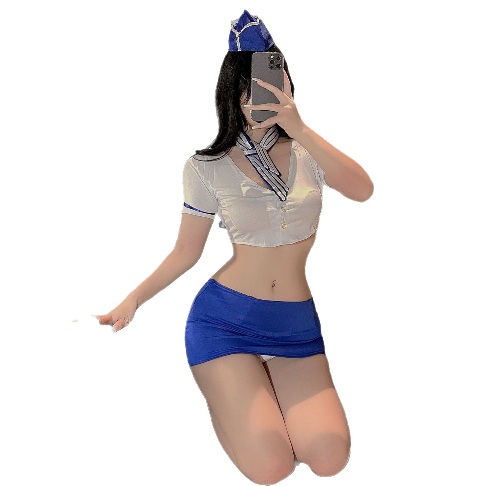 Night Fun Sexy Role-Playing Stewardess Uniform Passion Suit Policewoman Pure Desire Hip-Covering Short Skirt Leaking Breasts Pajamas Dropshipping