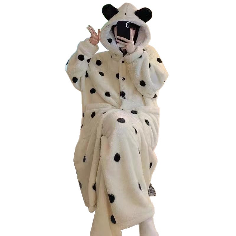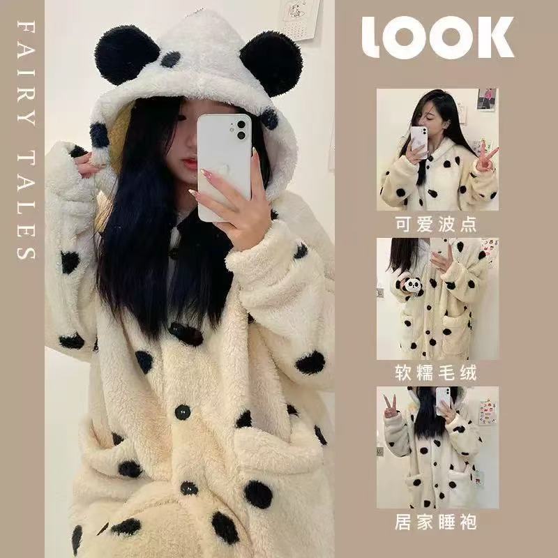 Pajamas for Women Autumn and Winter Coral Velvet Plus Velvet Thickeneded Flannel Bathrobe Hooded Nightgown Set Warm Home Clothes Cross-Border