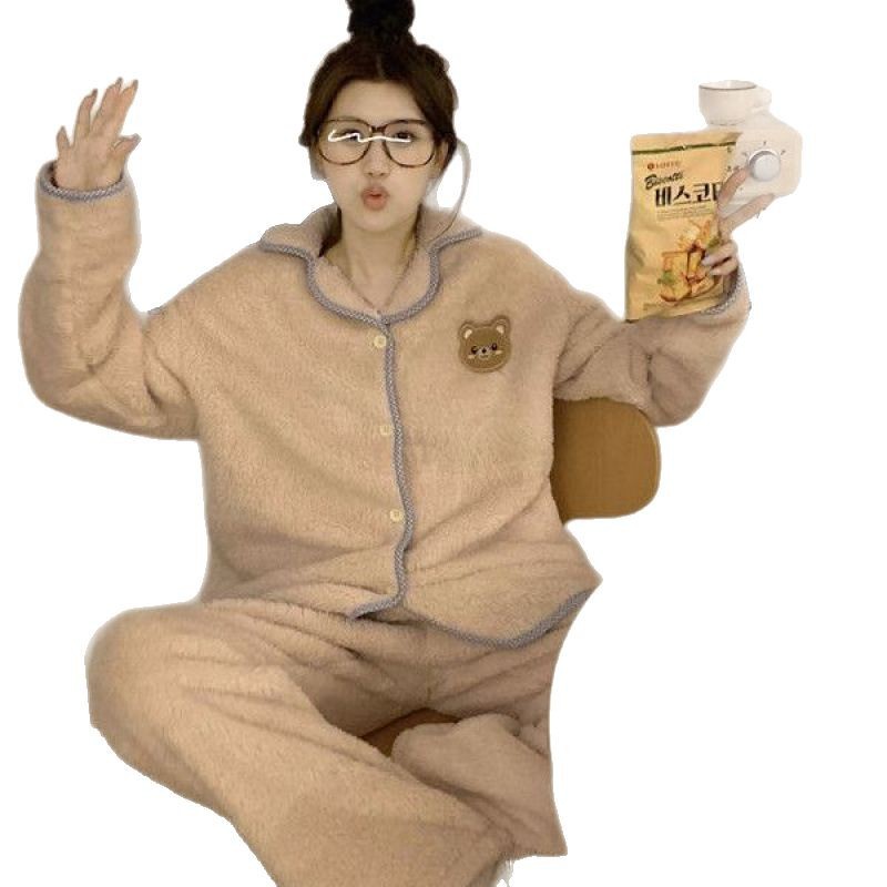 Pajamas Women's Autumn and Winter Thickened Cute Embroidered Shame Bear Coral Fleece Warm Cardigan Flannel Home Clothes Two-piece Set