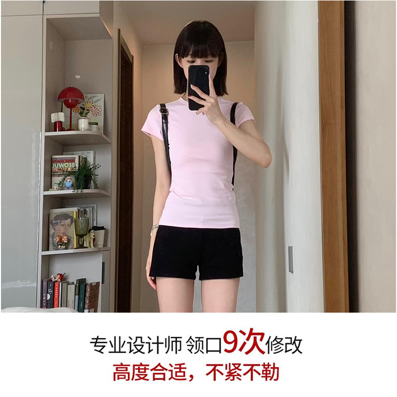 Pink Shoulder Short-sleeved T-shirt Women's Summer Slim-fit Half-sleeve Tight-fitting Pinch-waist Slimming Top with Base Half-sleeve Short