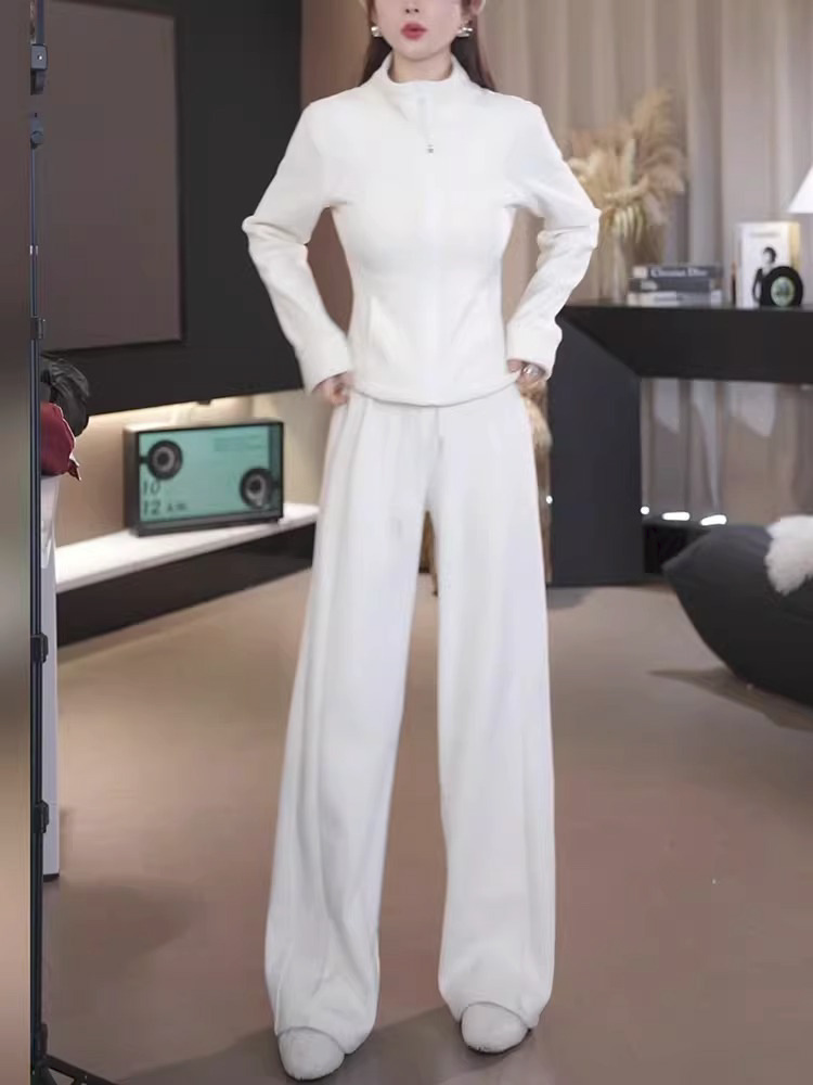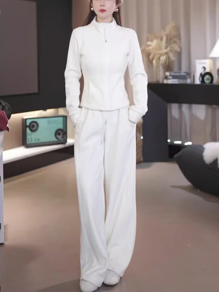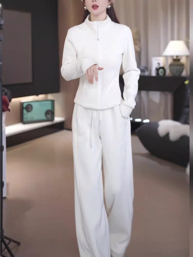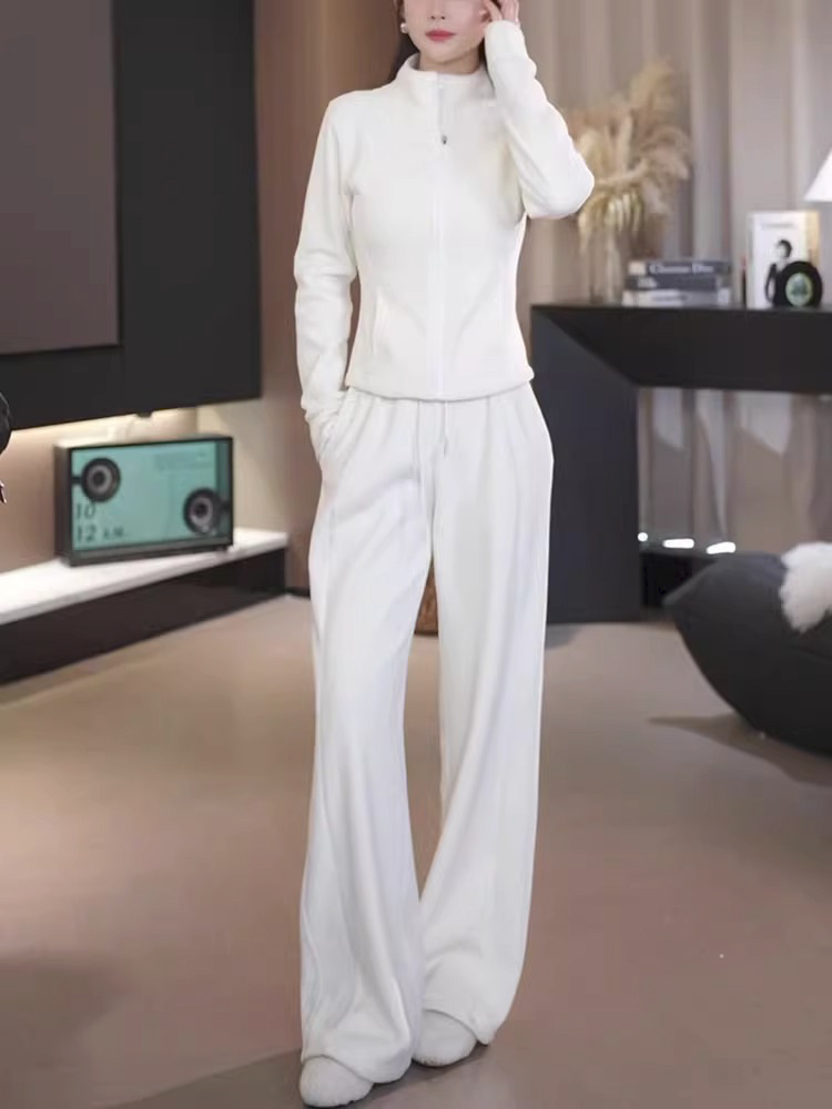 plus size women's casual sports straight trousers a set of solid color zipper cardigan warm sweater two-piece women's clothing